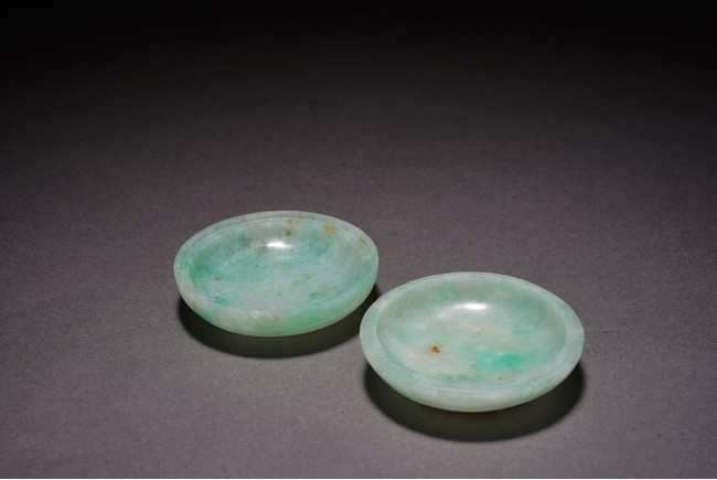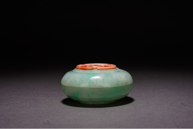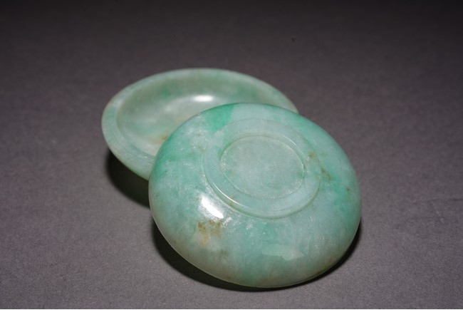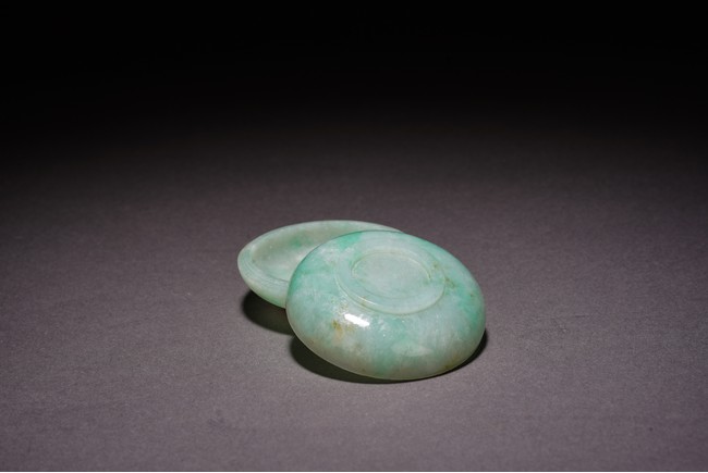 翡翠質地,色微綠,圓形盒。蓋嵌寶作團壽紋飾,蓋、盒子母合唇,光素無華,更顯富貴。 來源:聖地亞哥香港移民家族收藏 Provenance: Property from an old Hong Kong family collection resides in San Diego