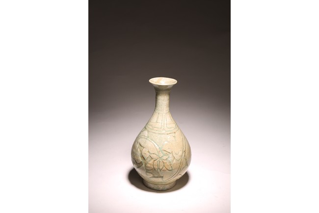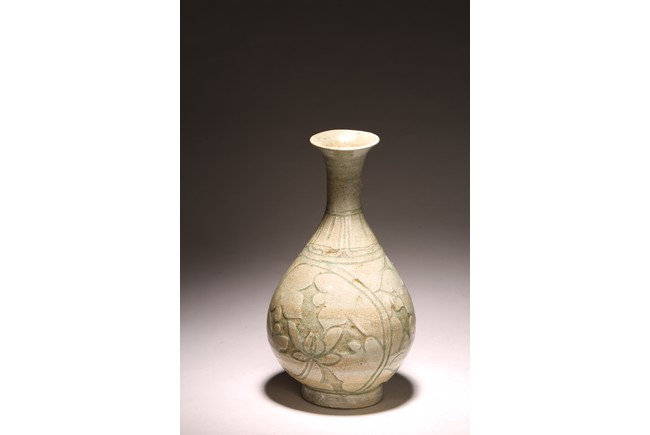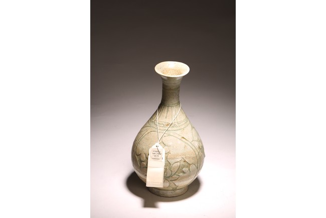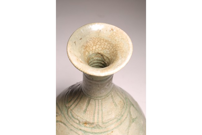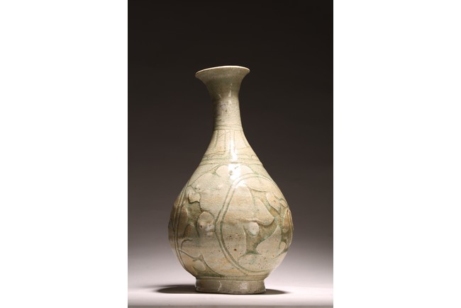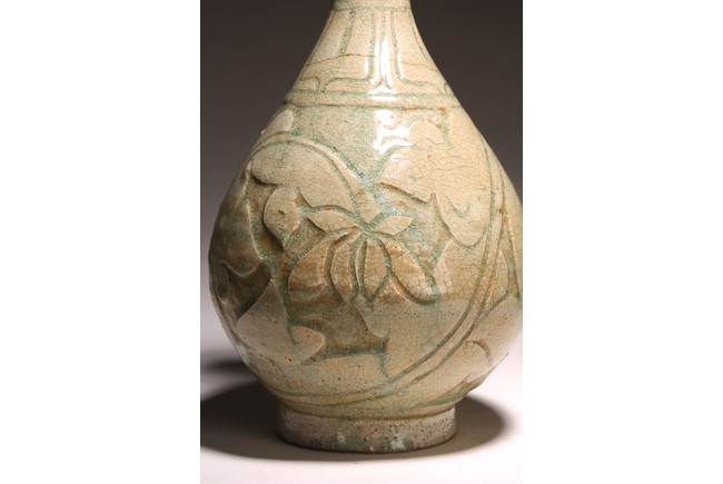 Chinese. The pear-shaped body rising from a straight foot to a waisted neck with flared rim, carved with floral scroll. Yuan Dynasty period.
