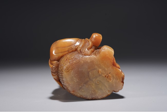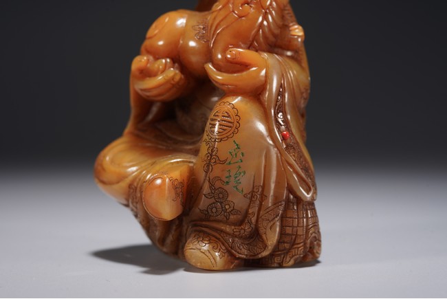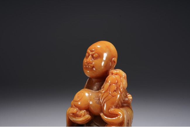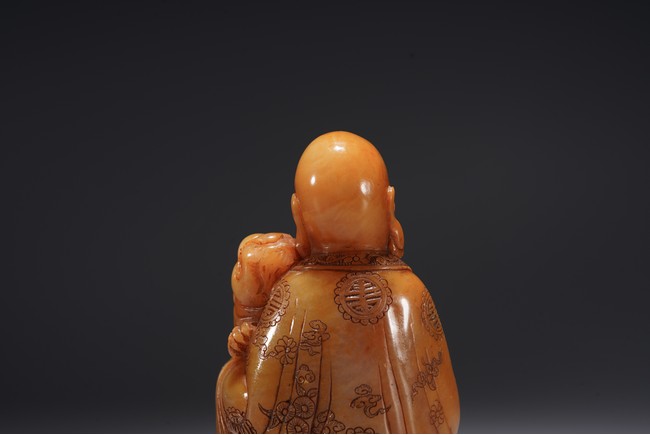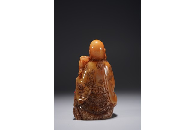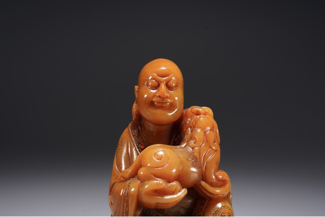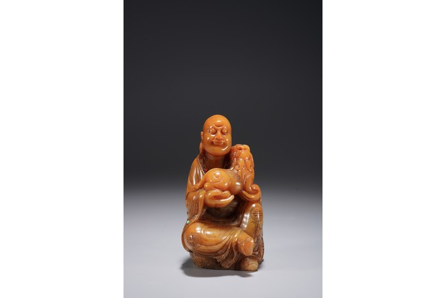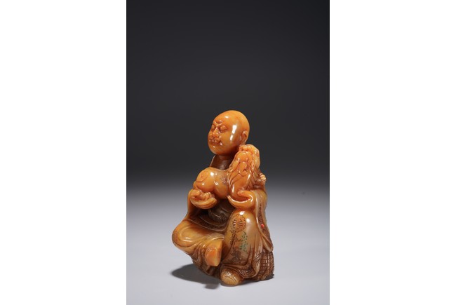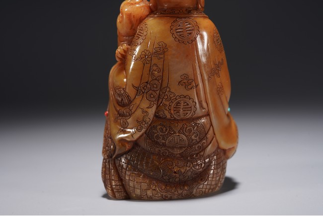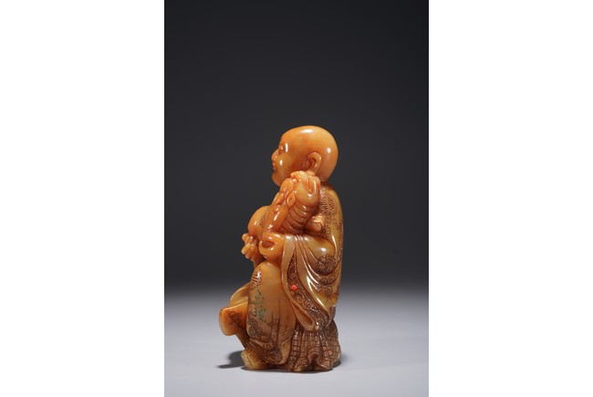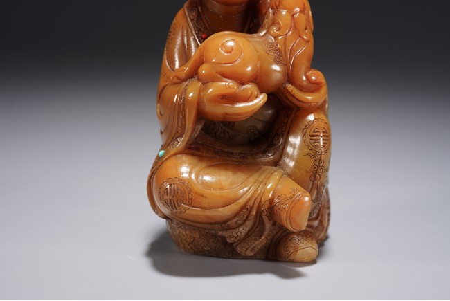 Chinese. The figure is shown casually seated and holding a lion cub, dressed in loose robe incised with floral scrolls and inlaid with beads.