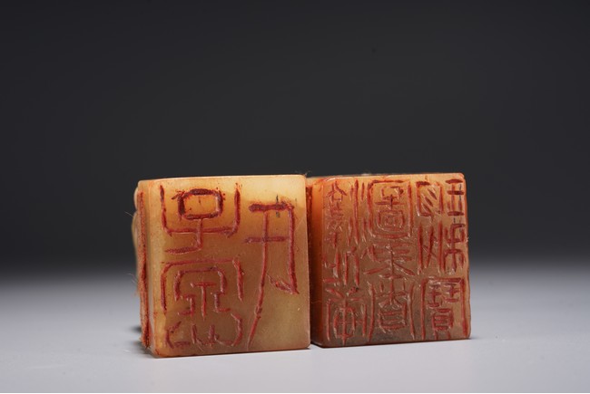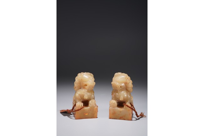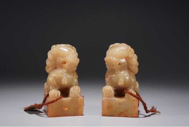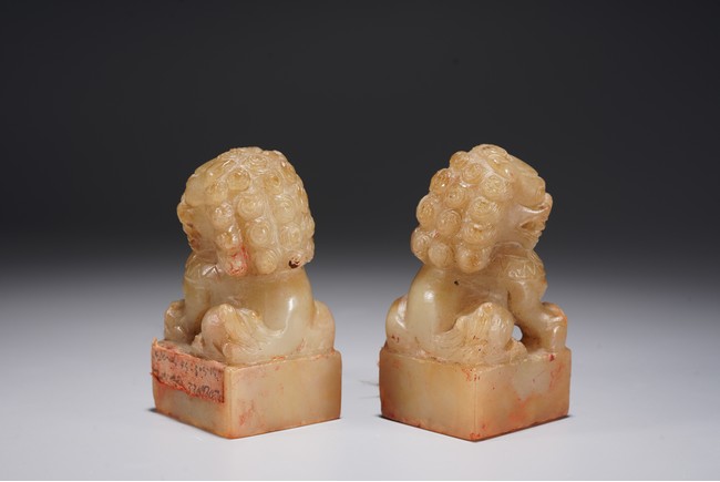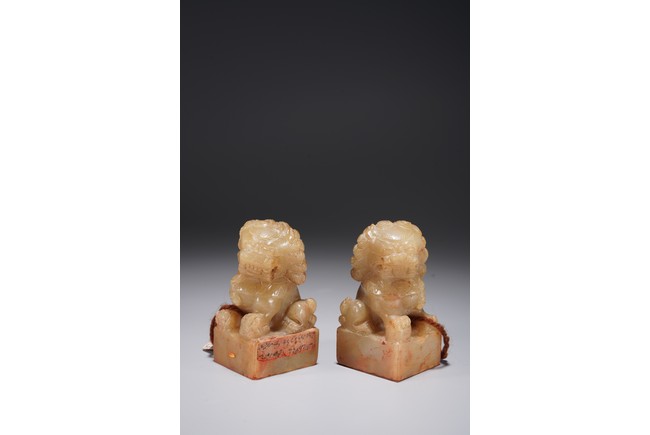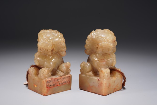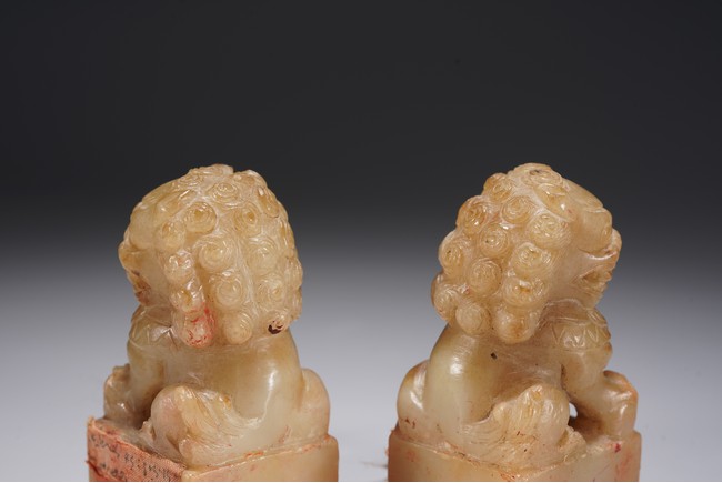 Chinese. Each of square section, the top carved seatd guardian lion, the seal face carved respectively with three characters and nine characters. Qing Dynasty period.