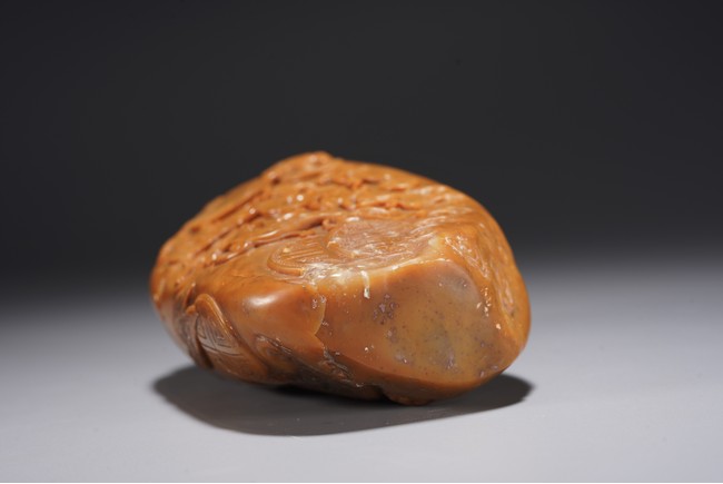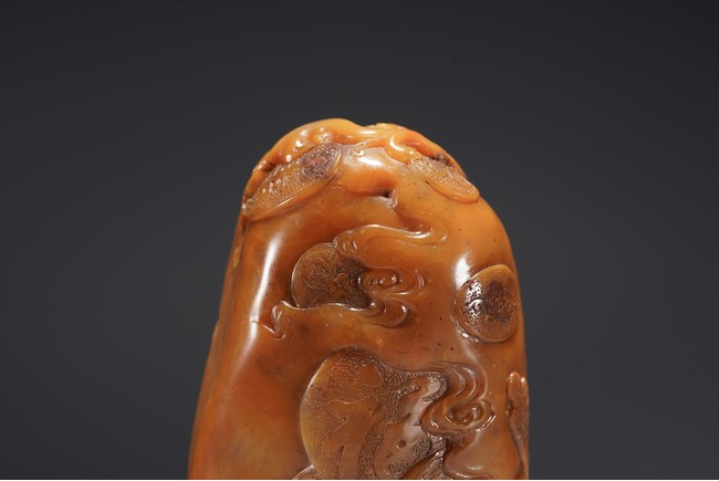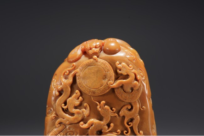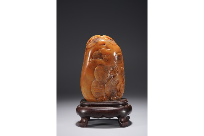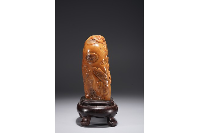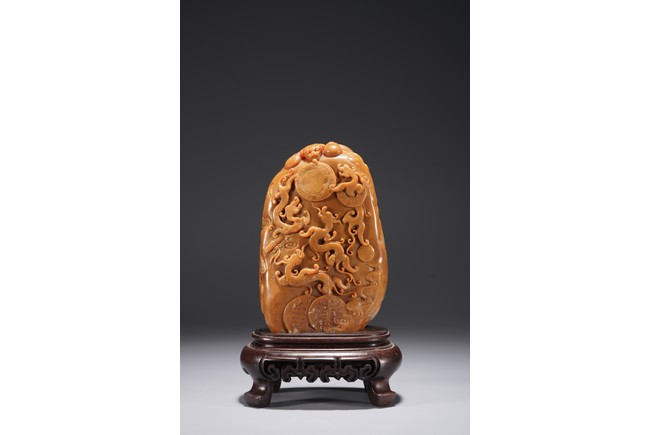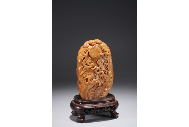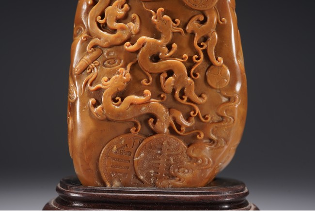 Chinese. Carved with sinuous chilongs chasing auspicious symbols in relief to the front and stylized characters to the back, the stone is of opaque caramel tone, hardwood stand.