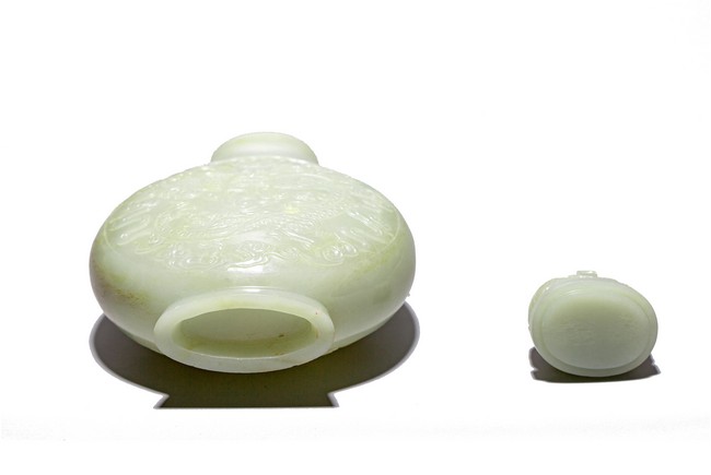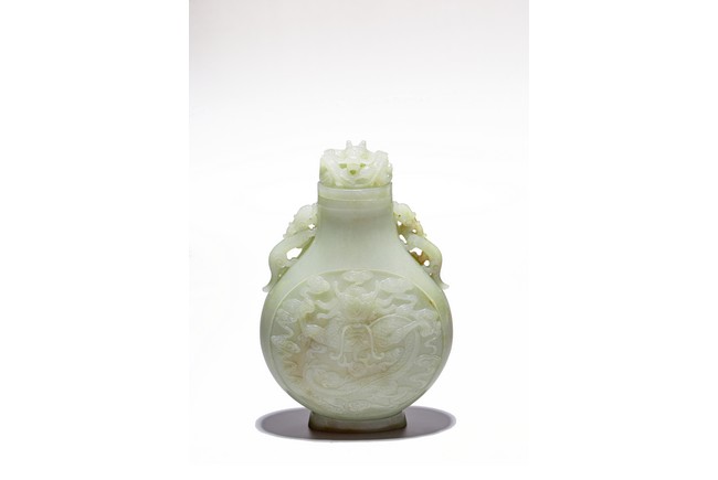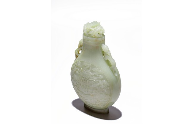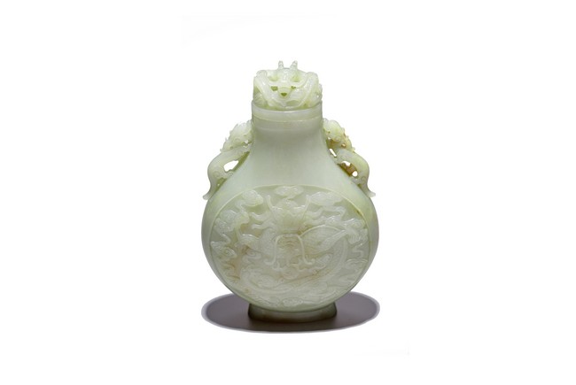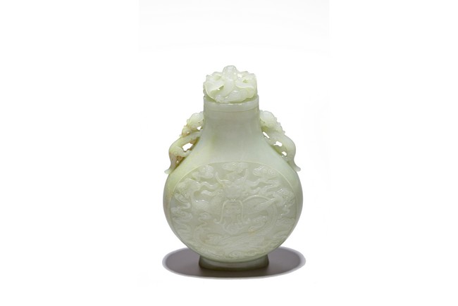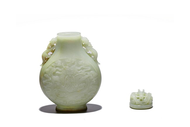 此瓶以上等玉琢成,玉質清冽,細膩溫潤,器身呈扁圓形,長頸,兩側飾雙螭龍耳,鼓腹,圈足,蓋鈕呈盤龍狀,傲立雄踞,望天吼嘯,靈動張揚,氣勢非凡。器身雙面浮雕飾正面龍紋,龍身矯健,蒼穹有力,張牙舞爪,氣勢雄渾。此瓶為陳設用器,優雅端莊,皇家氣韻十足。 來源:重要紐約私人玉器收藏 Provenance: Property from an Important NYC private Jade collection