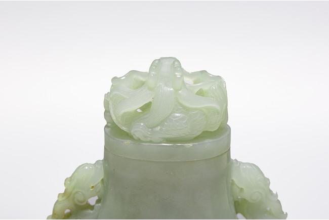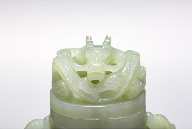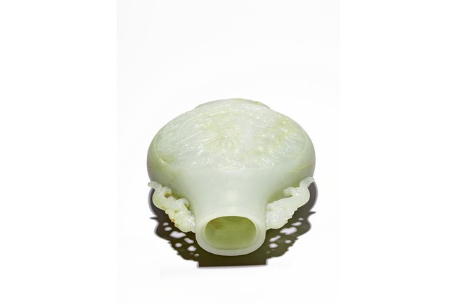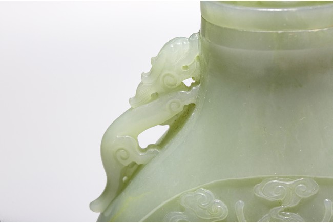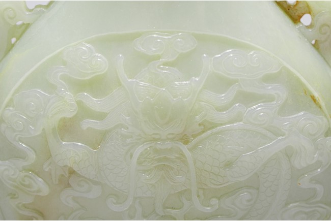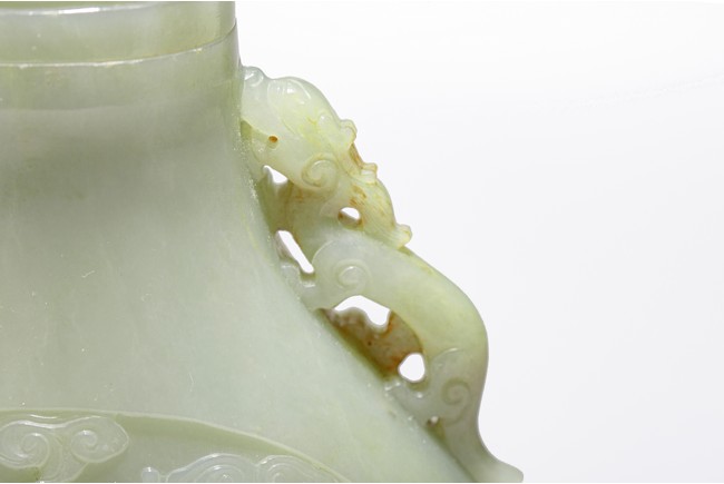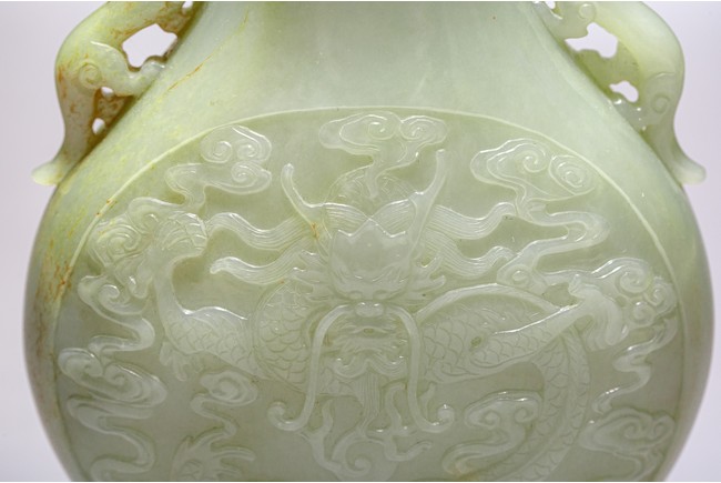 Chinese. Of flattened hu form, with elaborate archaistic animal-head mask 'handles' flanking the tapered neck, the front and back of the body carved in relief with a sinuous five-clawed dragon pursuing a 'flaming pearl' among scrolling clouds, all on a low spreading foot, the cover carved with a seated dragon. Mid-Qing Dynasty period.