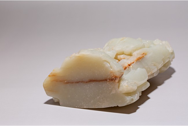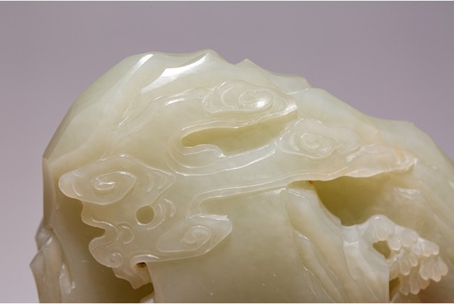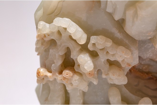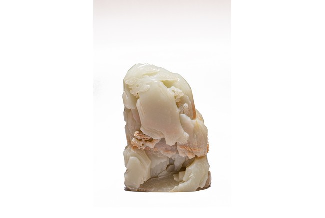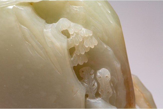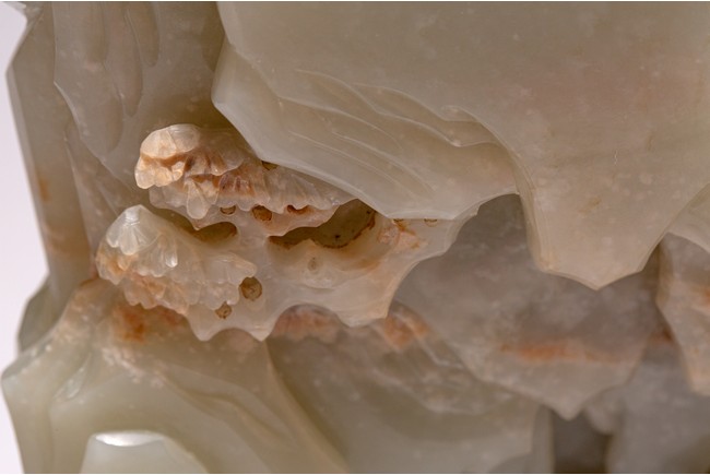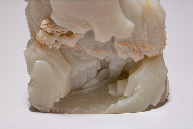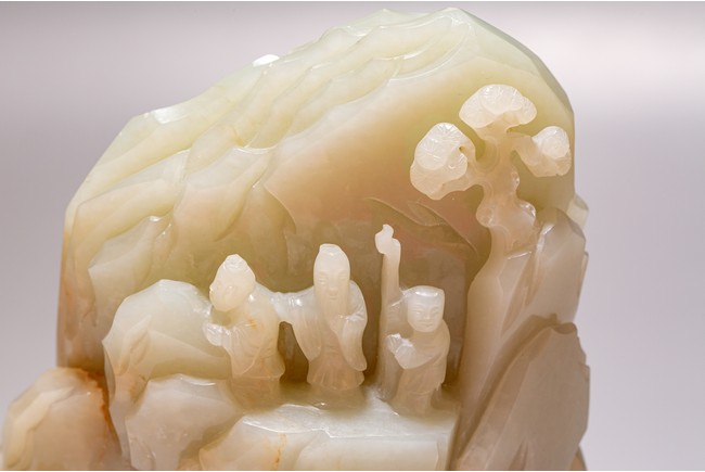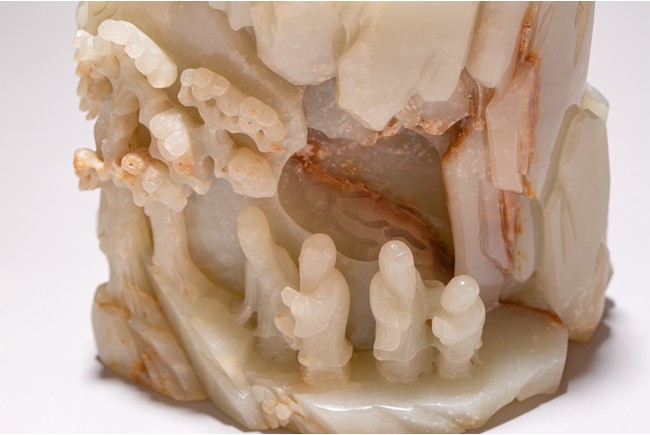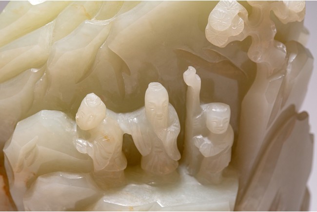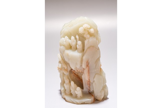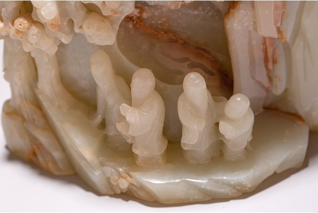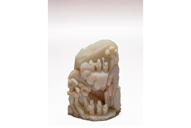 Chinese. The boulder finely carved to the front with figures consisting of elderly scholars and young attendants all set within a mountain landscape, the reverse carved with a boat traveling out of a grotto below pine trees issuing from the rocks. Qing Dynasty period.