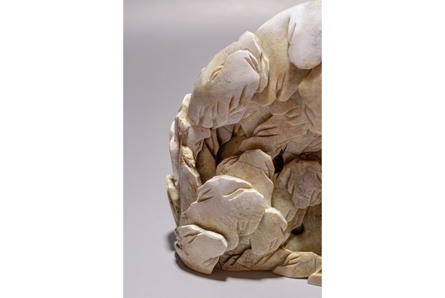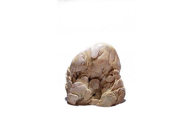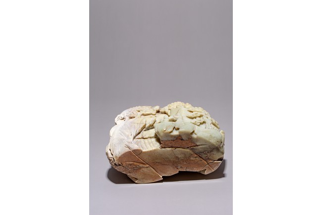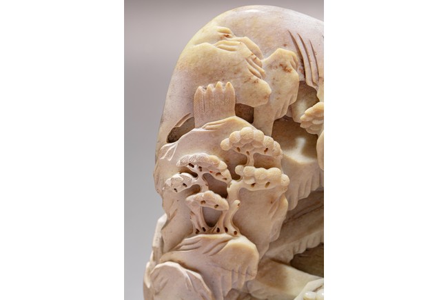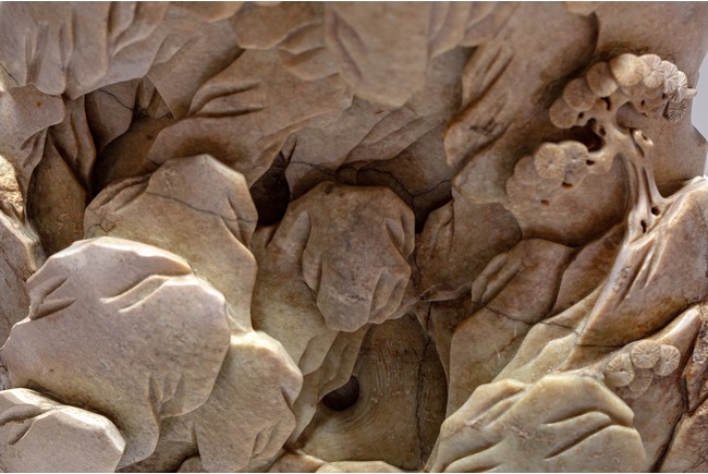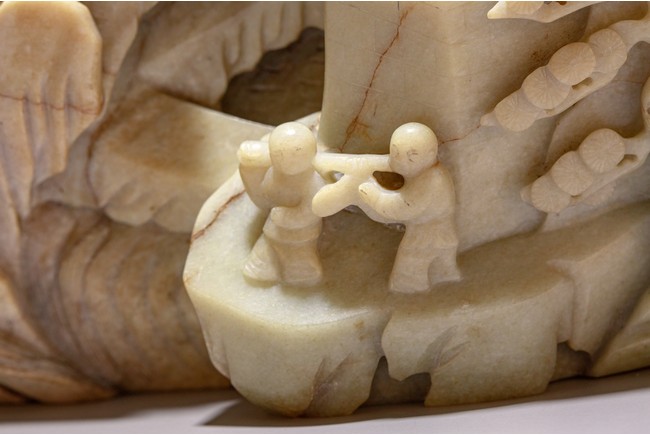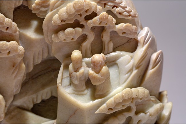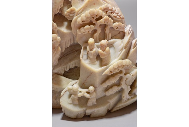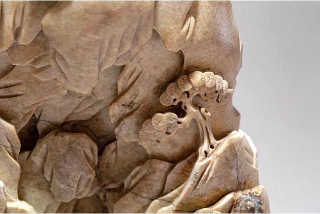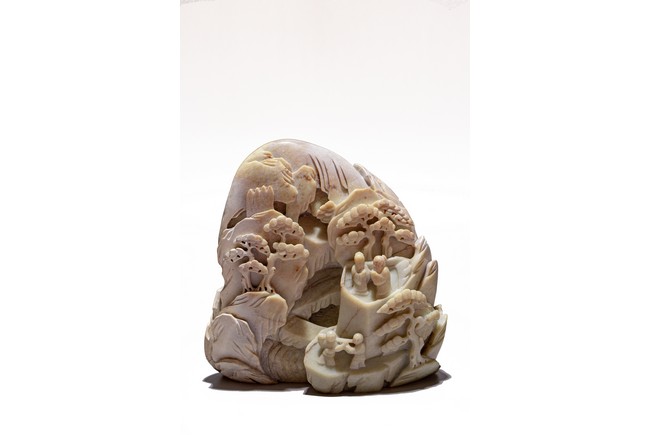 Chinese. The boulder carved with two elderly figures standing on a cliff above two young attendants, next to jagged rockworks and pine trees, the reverse with further rocks.