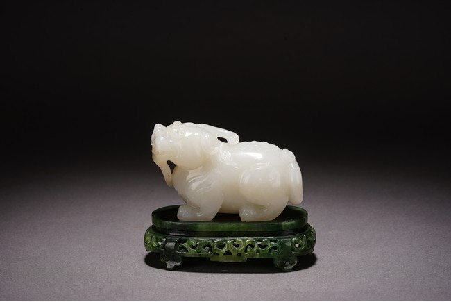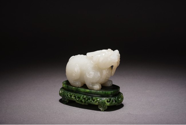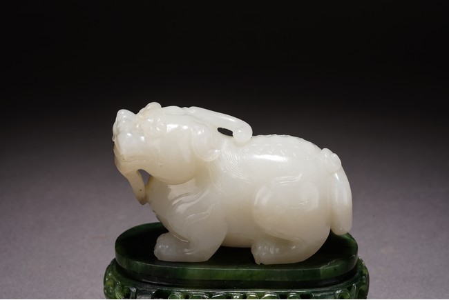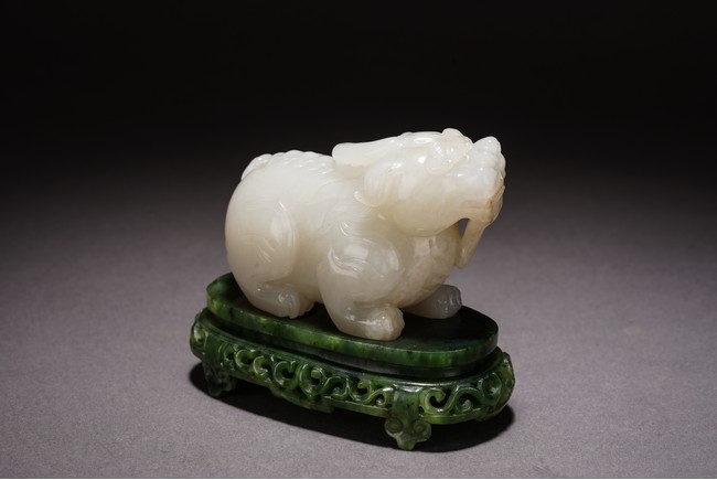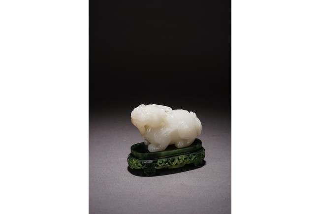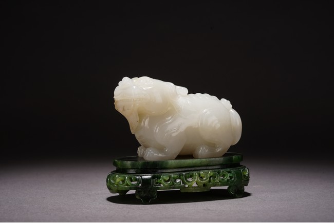 Chinese. Carved in the form of a seated mythical beast with a single horn, with bulging eyes and a pointed beard, the tail curled around its left haunch, the stone of white tone, along with a spinach green jade stand. Qing Dynasty period.