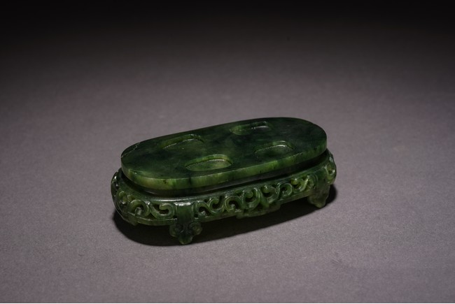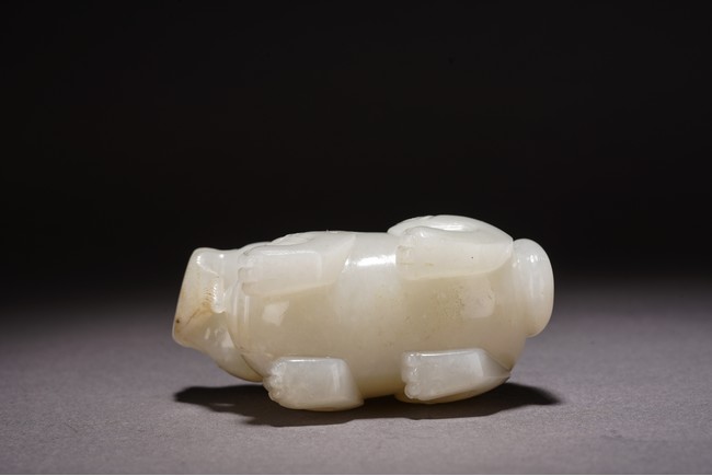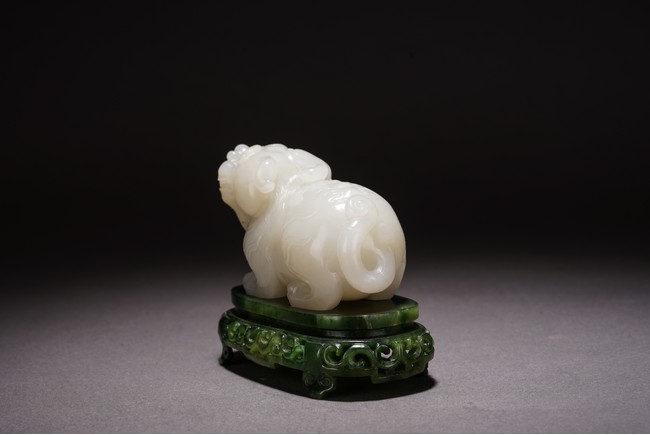 此件作品和田白玉籽料材質,料質油潤精良,瑞獸圓雕古樸典雅,氣度非凡,下原配碧玉底座,保存如此完整,實屬難得。