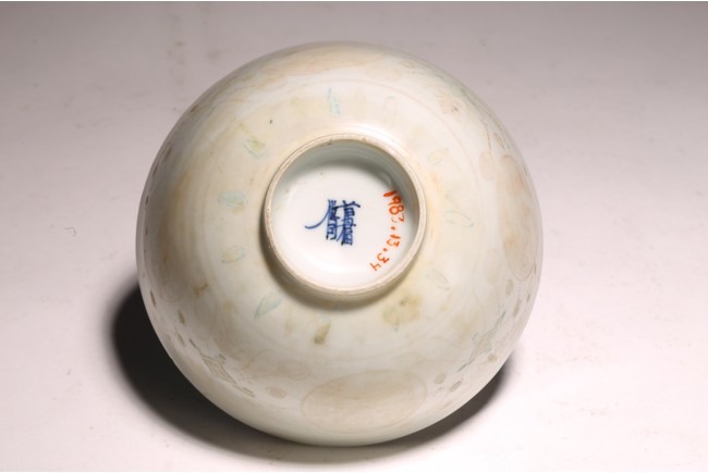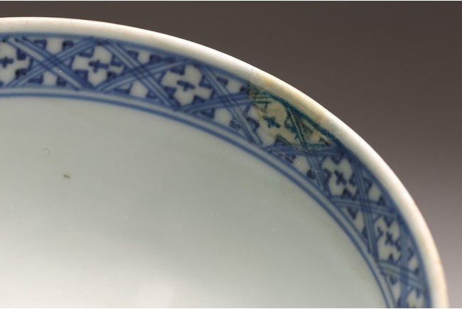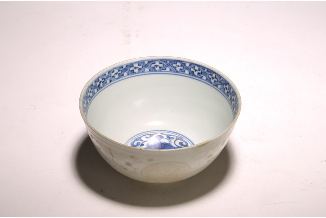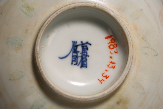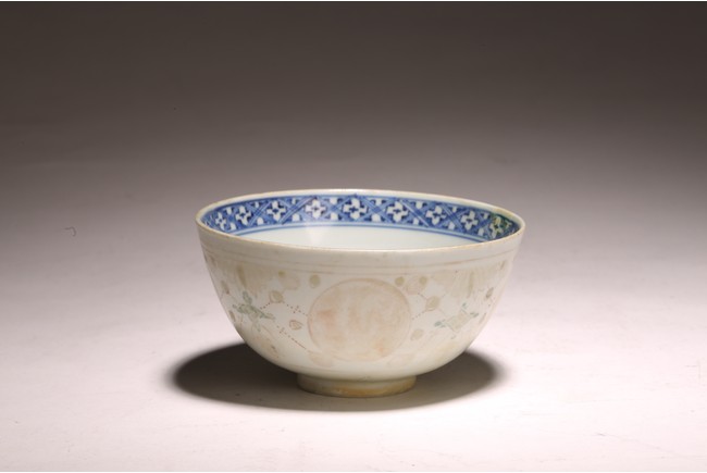 Chinese. The body exterior decorated in enamels to depict geometric pattern, the interior further decorated in blue with flower mendallion to the center, the base inscribed with a four character Wan Li mark. Qing Dynasty period.