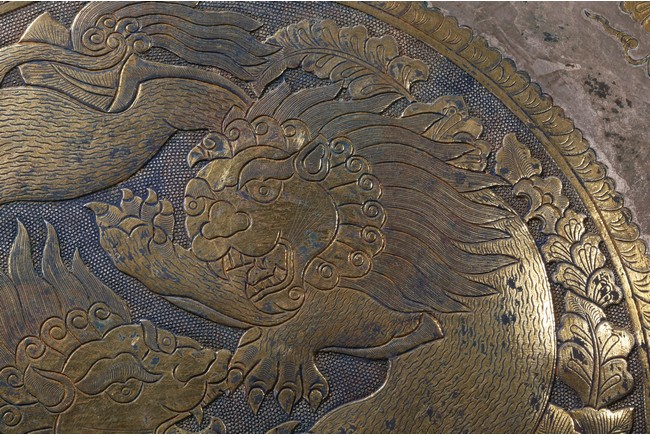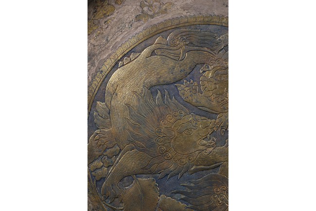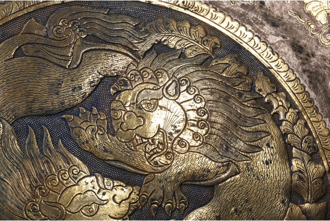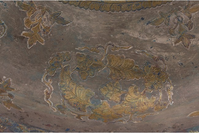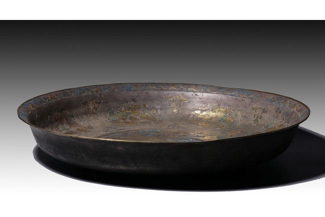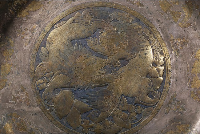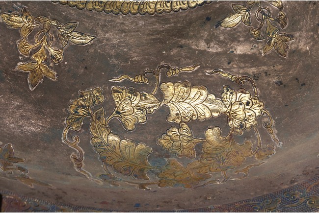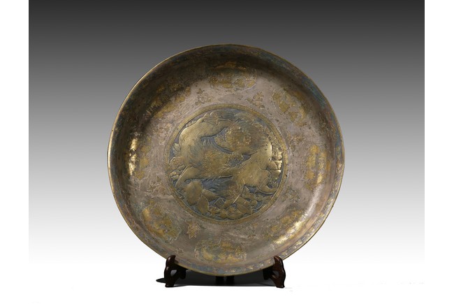 此盤造型富貴華麗,金彩奪目絢麗,其上鏨刻“卷草花卉紋”“雙獅紋”,花朵雅緻清麗, 枝葉舒展自如,華貴而不艷俗;雄獅威武霸氣,雙目圓睜,張頷吼叫,四肢、軀幹造型飽滿、 生動,極富張力和表現力。整體紋飾層次分明,局部鎏金,金銀二色對比強烈。在當時金銀器不僅具有財富價值,還是帝王用於賞賜,用於供奉神靈。並且還有官員給帝王進奉的過程 中,起到了影響政治,宗教,軍事等各個領域的作用,細觀此器工藝非宮廷造辦處良工而不能為。