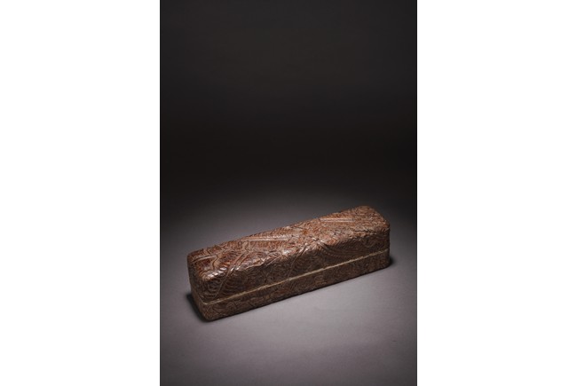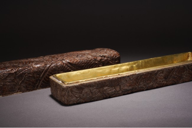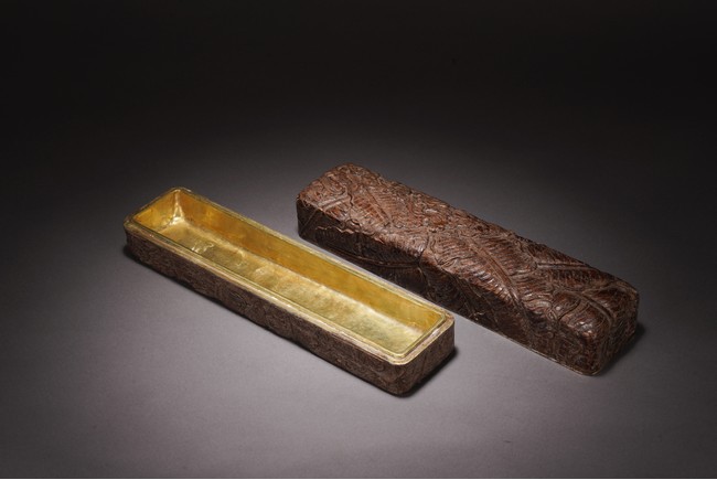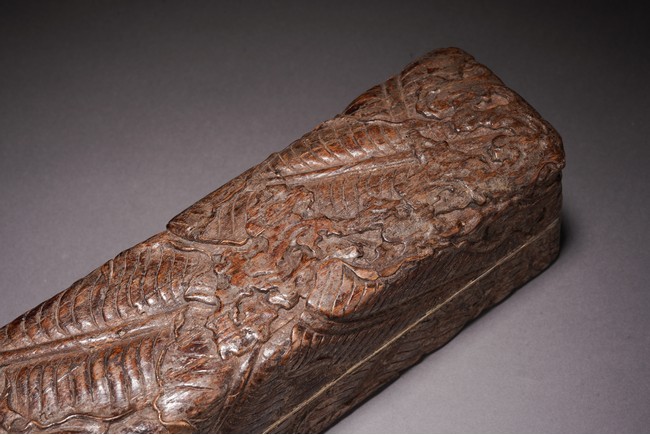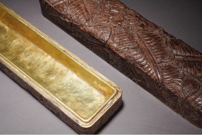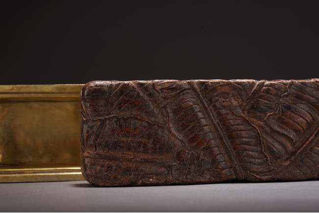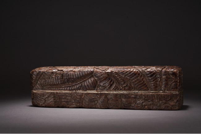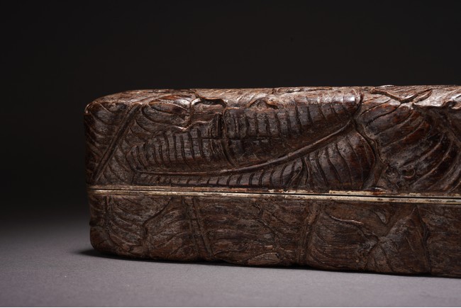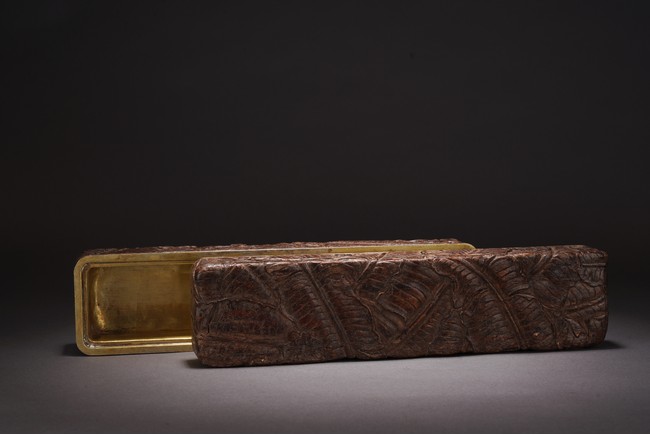 Chinese. Of rectangular form, the aloeswood box carved to the exterior with banana leaves all over, the interior mounted with richly gilt silver ground. Qing Dynasty period.