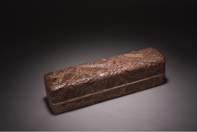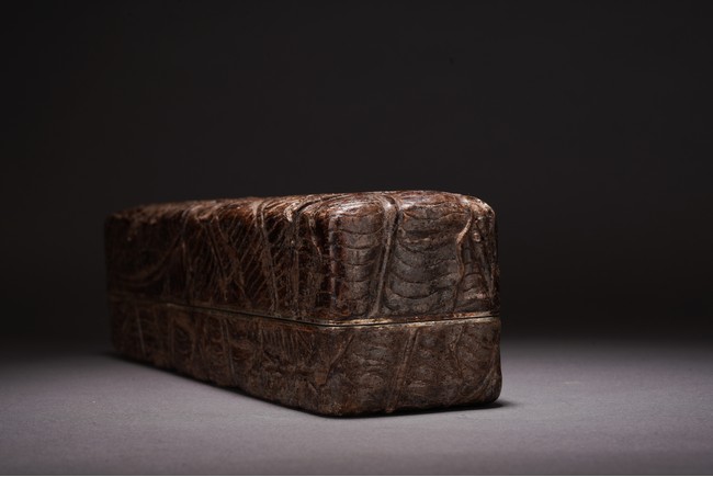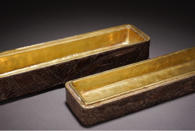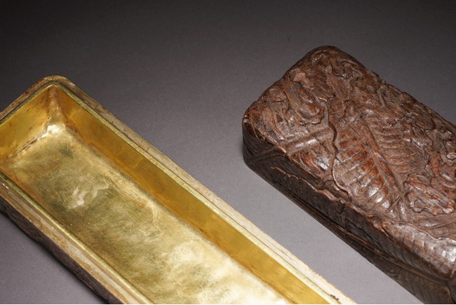 此件蓋盒子母口,長方形,周身淺刻蕉葉紋是,內堂嵌銀鎏金內膽,非常厚實,手感極佳,宮廷氣息顯著。