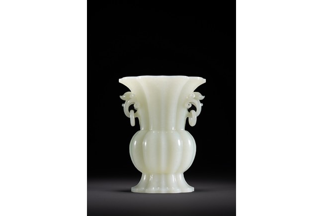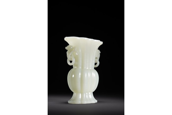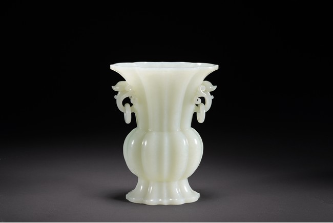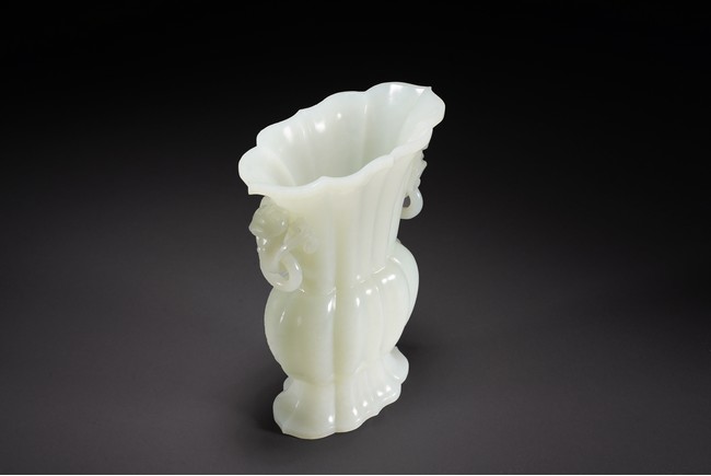 Chinese. The vase is formed of lobed oval cross-section with flaring neck rising to a barbed rim. The body is carved supported on a splayed foot of conforming outline, and flanked by two carved animal masks with suspended loose rings. The stone is of an even white tone. Qing Dynasty period.