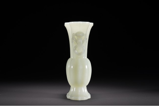 觚為商周青銅器,屬於酒器之一種,基本形制為敞口、長身、圈足,口、底皆為喇叭形,造型秀美。故後世亦流行以各種材質仿製,為文房陳設用器。此花觚取材白玉,整體打磨細緻,溫潤古樸。菱花形口,直頸斂收,腹部微鼓,近底部微外撇,足部與口沿呼應亦為菱花形。整器內外打磨光素,外壁依口沿起棱線,更增線條之美。 來源:洛杉磯重要私人收藏 Provenance: Property from an important Los Angeles private collection