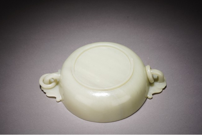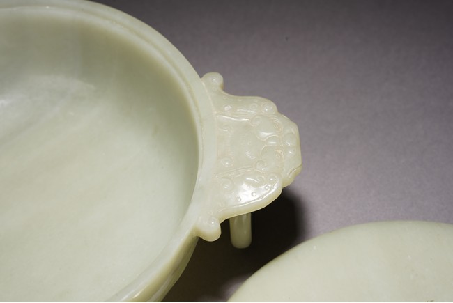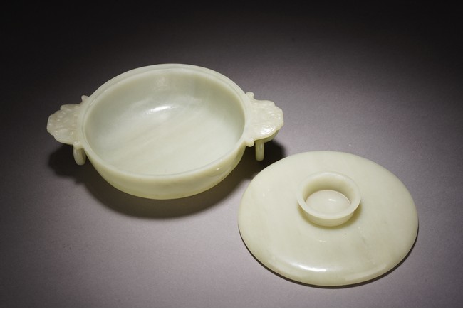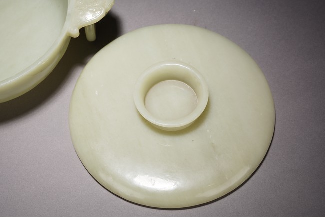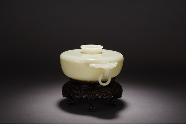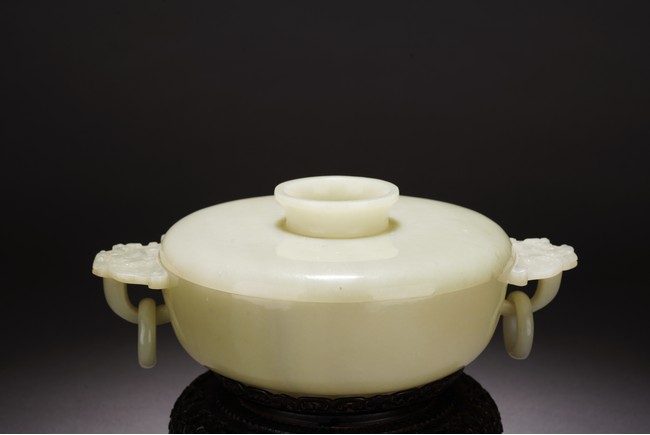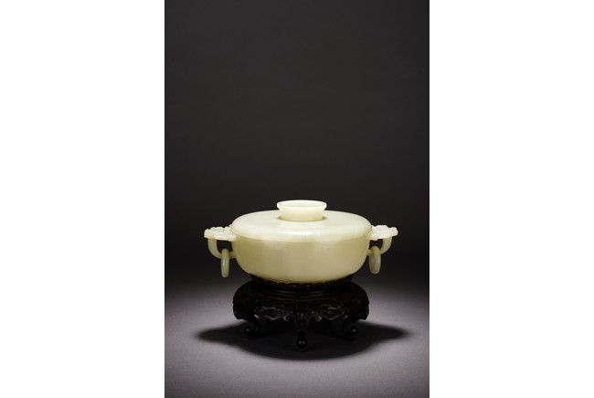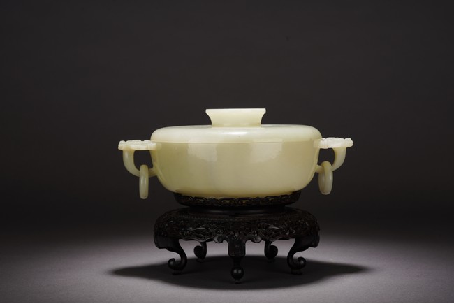 此作品以白玉為材,玉質堅實,沈凝沈蘊,潤色晶瑩。蓋頂圓形鈕,覆碗式蓋,弧腹,下設圈足,溫潤之美展露無遺,爐體兩側雕獸面形耳,設計巧妙,下有活環,爐蓋與爐身面光素潔,更顯華美非凡。該爐原配有紫檀鏤雕底座,與玉爐搭配,天造之作。整體繁簡有序,典雅大氣。 來源:南加州私人收藏 Provenance: Property from a private collection, Southern California
