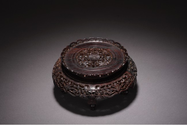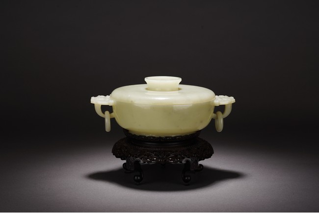 Chinese. The rounded sides rising from short foot, flanked by a pair of mythical beast head handles suspending loose rings, the slightly domed cover surmounted by a circular knop, all supported on rosewood stand. Qing Dynasty period.