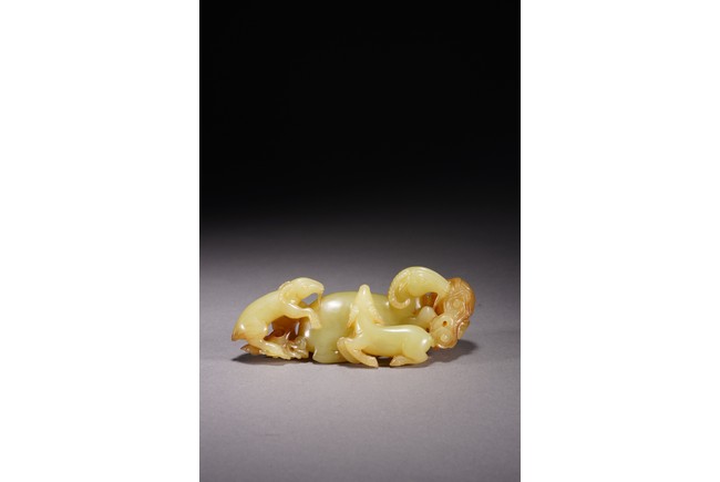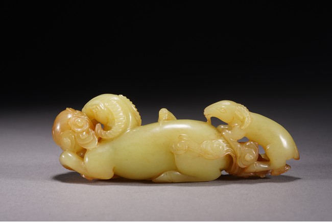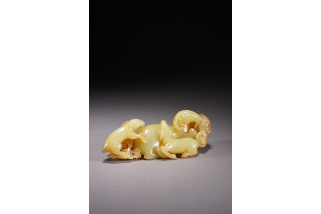 Chinese. Carved in the form of a recumbent ram with two lambs playing next to it, the stone is of smooth polished yellow tone with ruset inclusions. Qing Dynasty period.
