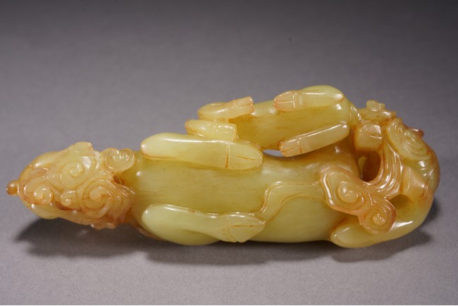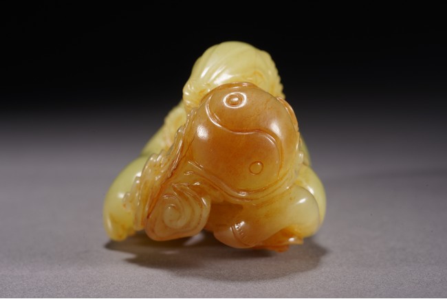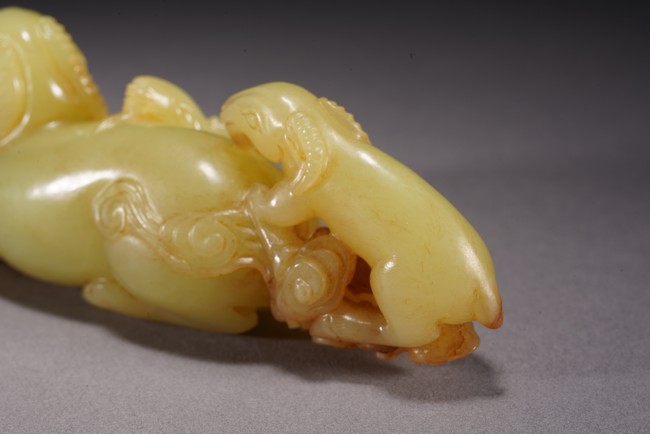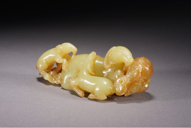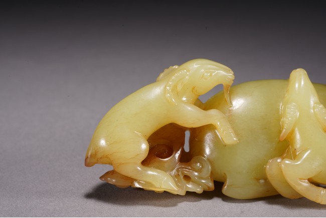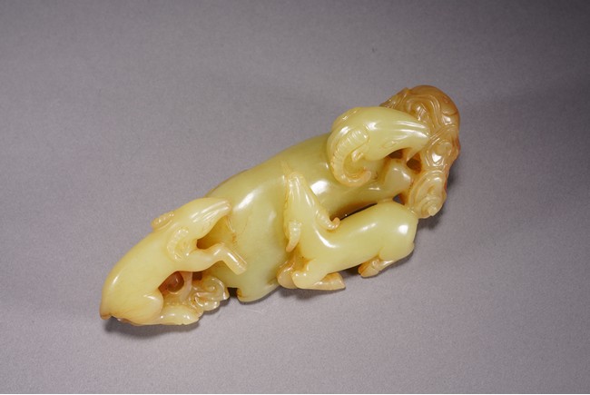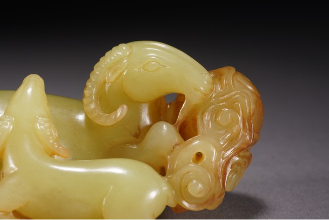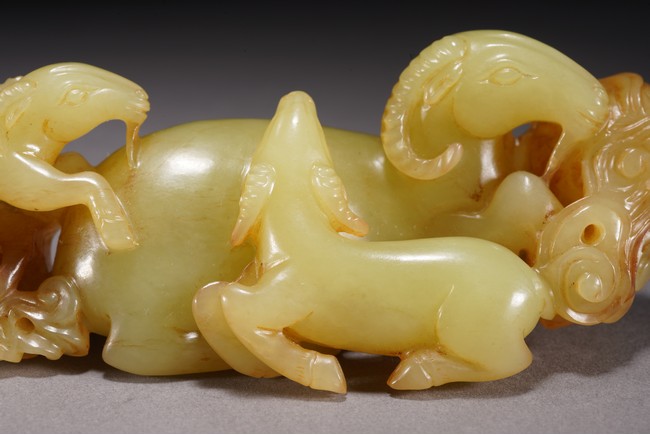質細潤,色黃正,既不泛灰,也不偏綠,且黃玉原料多綹裂,能出大材者較為少見,此圓雕三陽開泰為飾,佈局錯落有致相合交融,神態憨厚溫順,取意十分祥瑞,當為案上雅器。