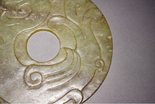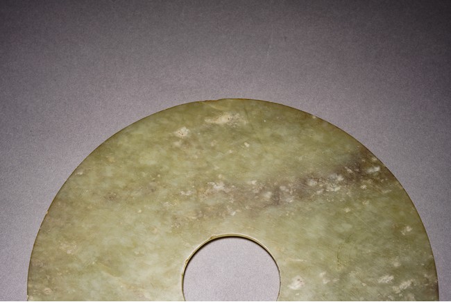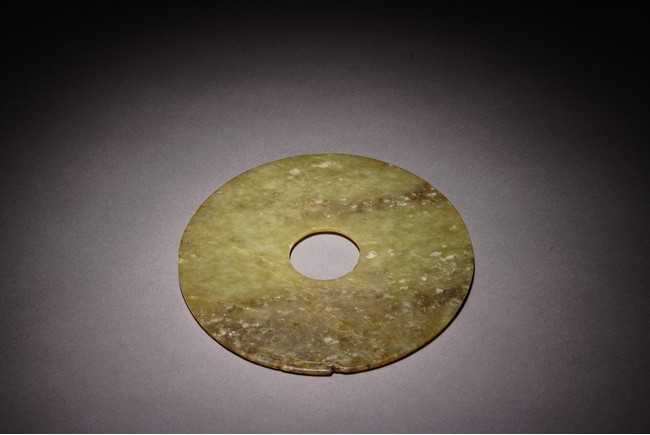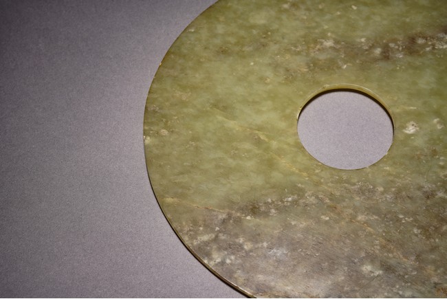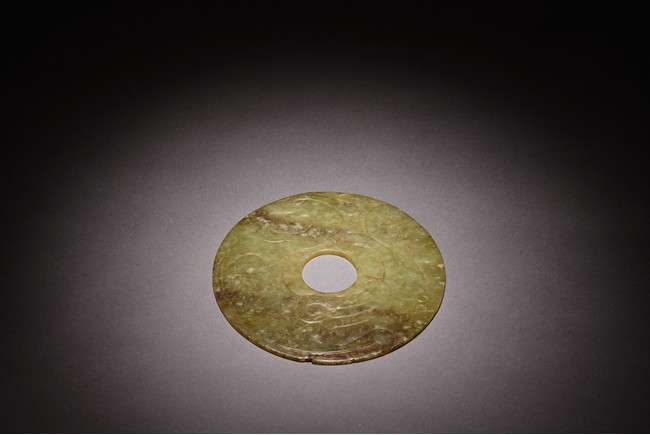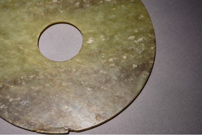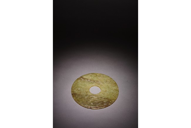 Chinese. Of circular form, the disc carved in low relief with a large phoenix , the reverse uncarved. The stone is of celadon tone with russet inclusions. Western Zhou Dynasty period or later.