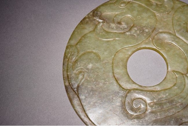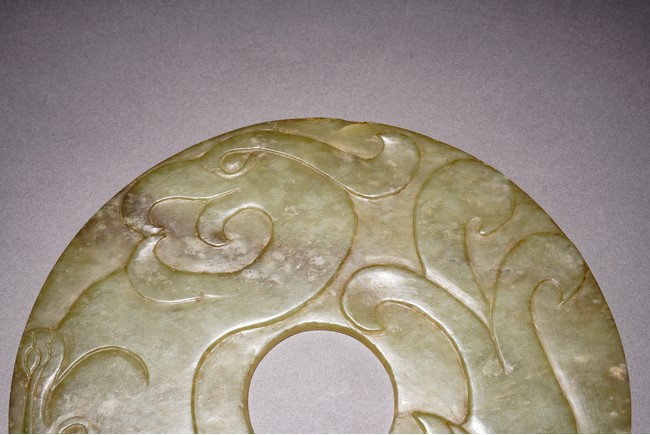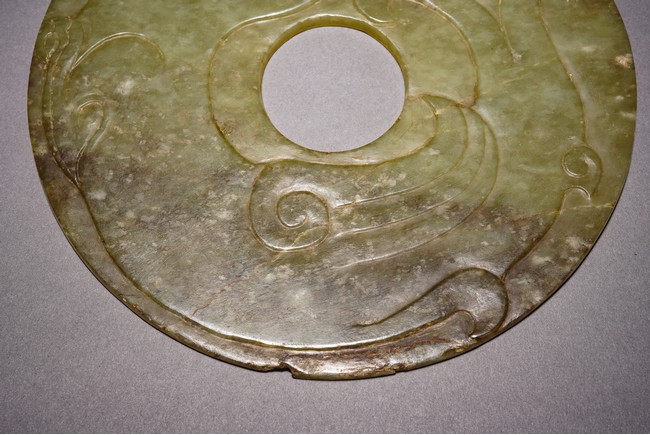 此玉璧體扁圓,中心圓孔。古玉材質,璧上浮雕螭龍紋飾,其質古樸溫潤,包漿上佳,隨古玉本身肌理現斑駁紋飾,渾然天成,豐富多姿,此品乃其珍賞之物。