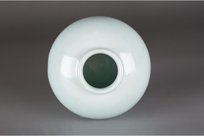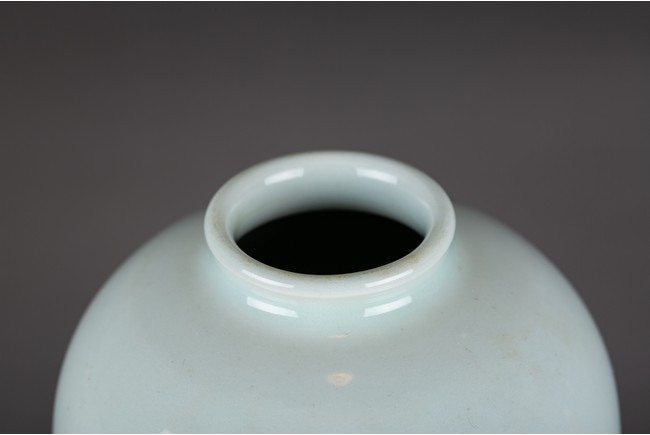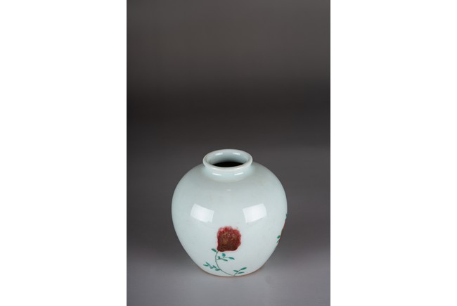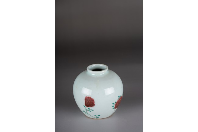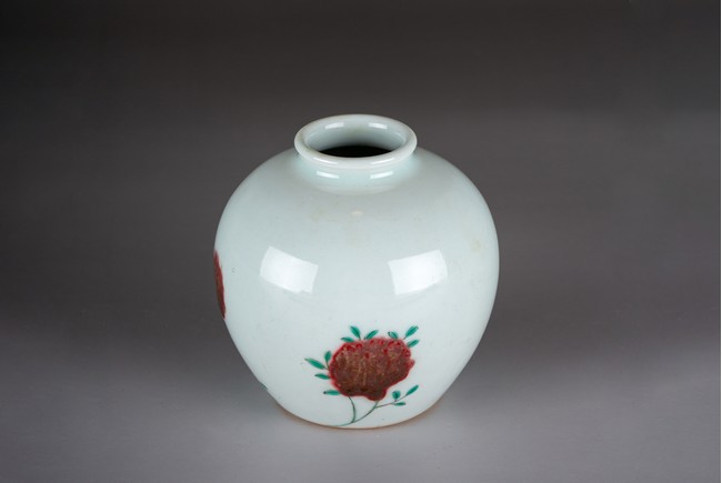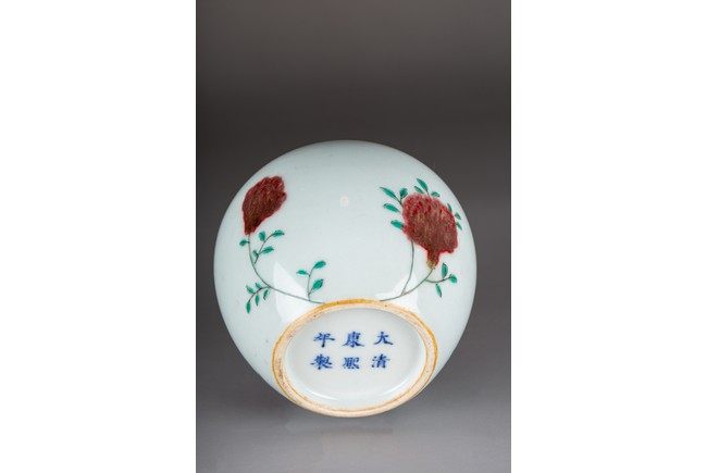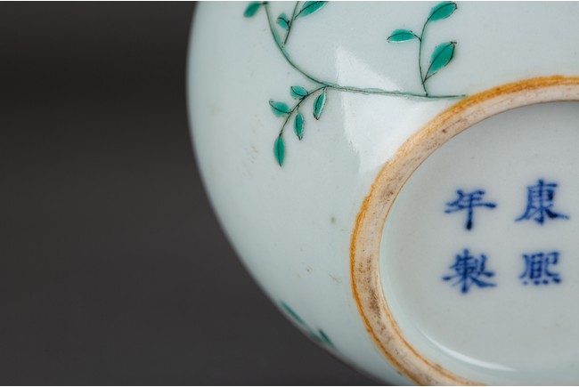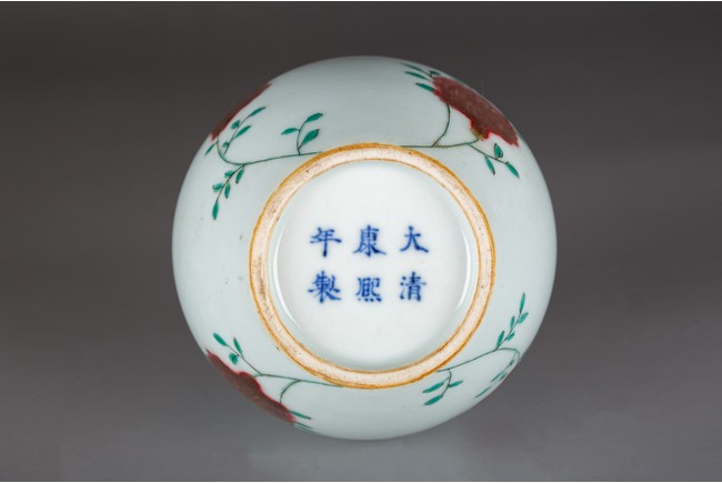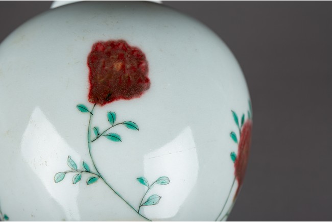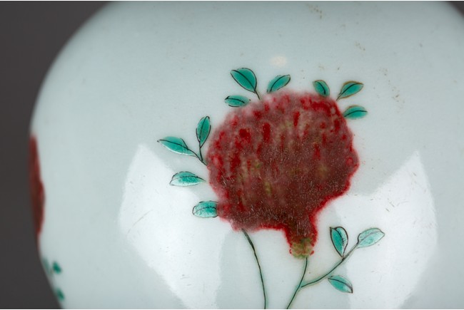 Chinese. Of ovoid form, the body painted in underglaze red and green enamel with leafy flowers. Base inscribed with Kangxi reign mark.