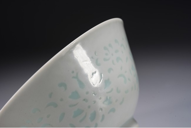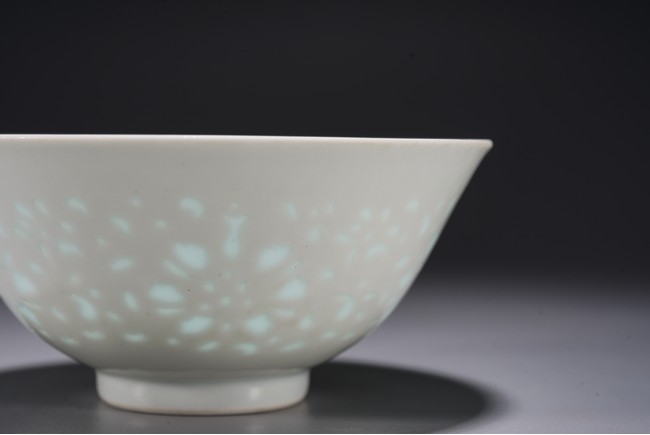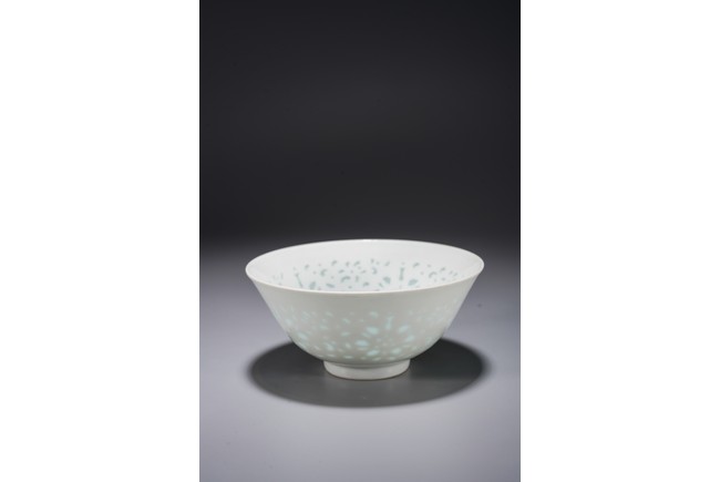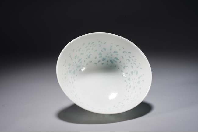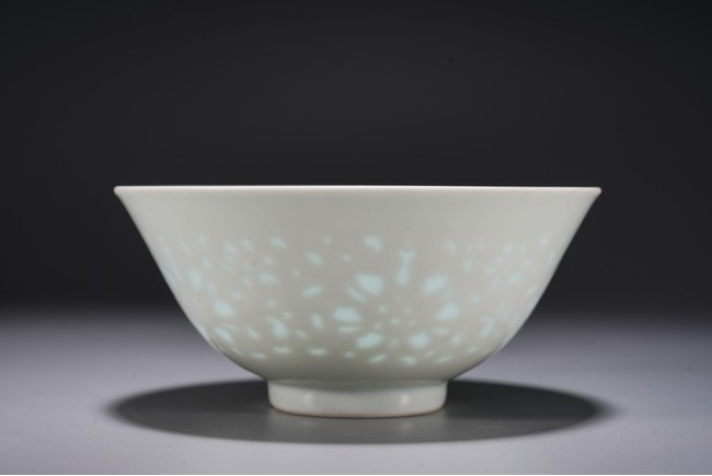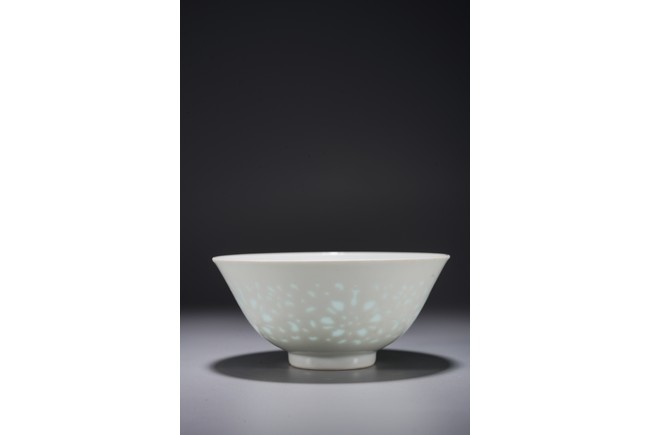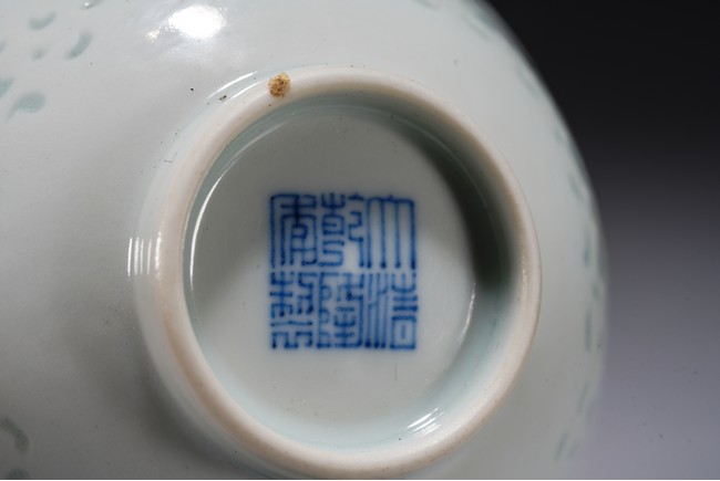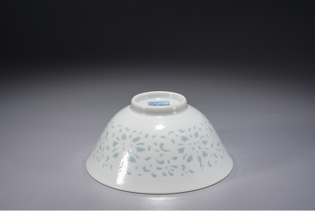 Chinese. Thinly potted with wide everted sides rising from a straight foot to a slightly flared rim, delicately pierced around the body with a broad band of formal lotus scrolls filled with a transparent colorless glaze to produce the effect of lace, the base inscribed with a six-character reign mark in underglaze blue. Qing Dynasty period.