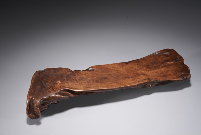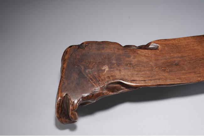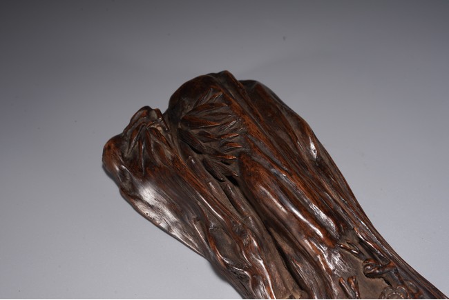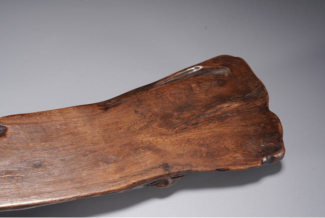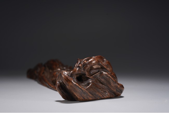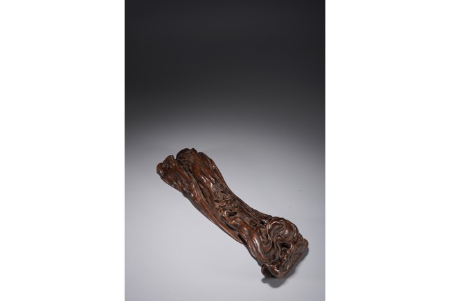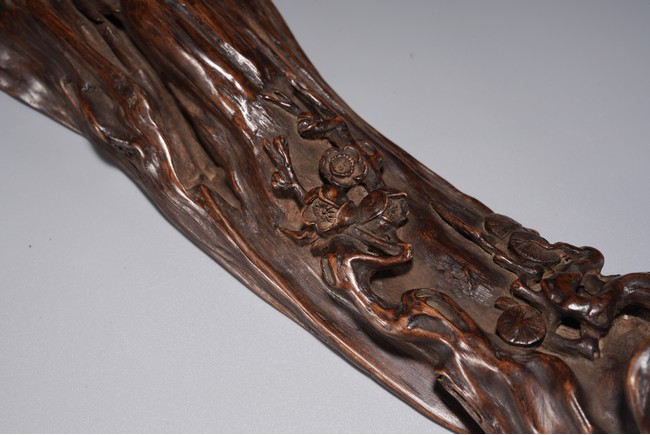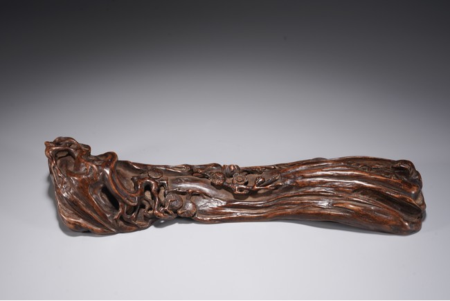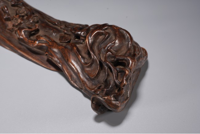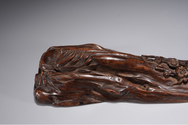 Chinese. The slender horizontal agarwood carved in the form of large trunk with gnarled pine branches and plum blossoms issuing from the side. The carving with characteristic aroma. Qing Dynasty period.