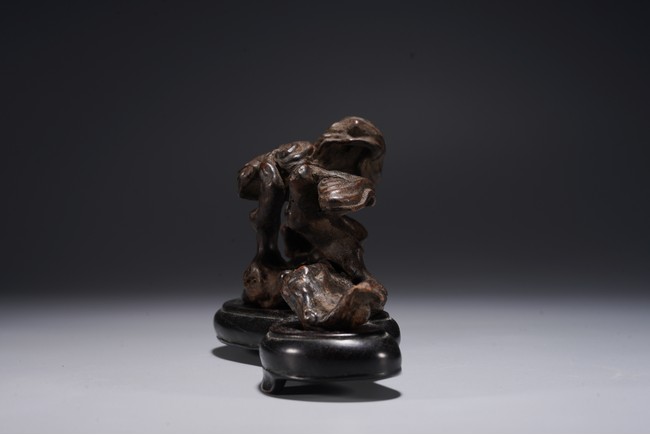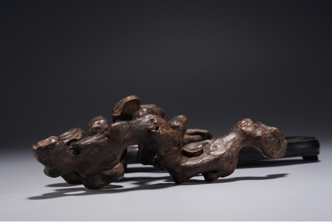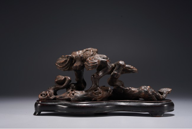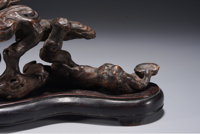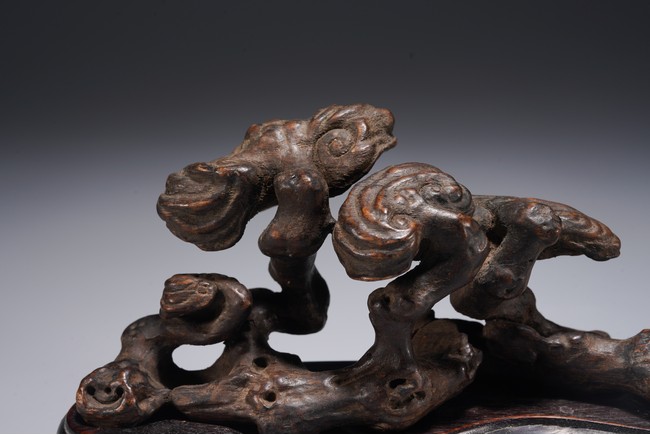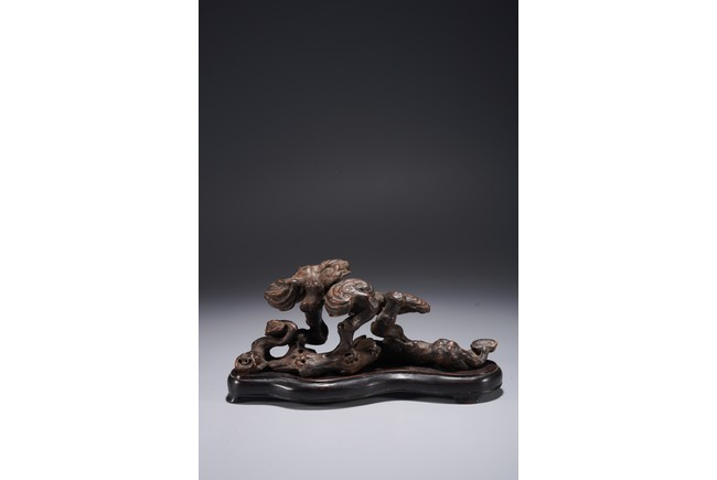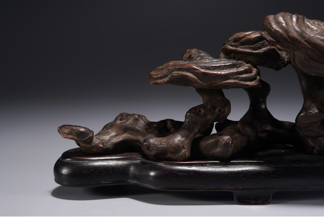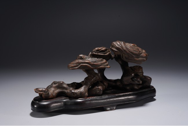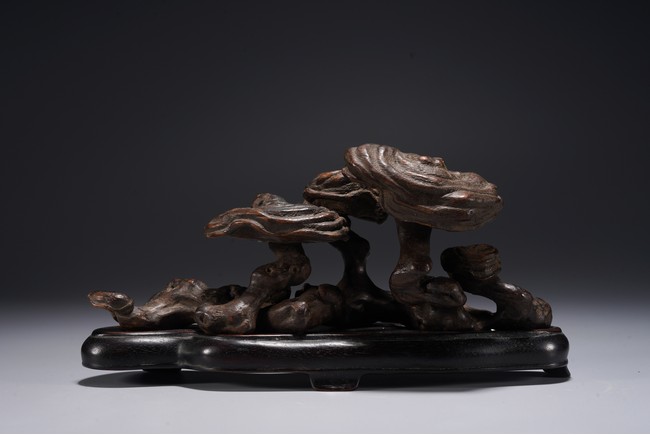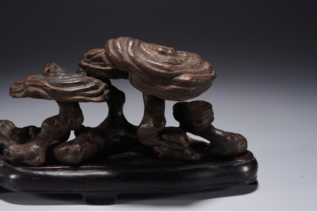 Chinese. Carved in the form of three gnarled lingzhi branches with three large lingzhi heads, all supported on a rosewood stand. Qing Dynasty period.