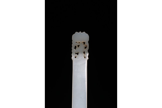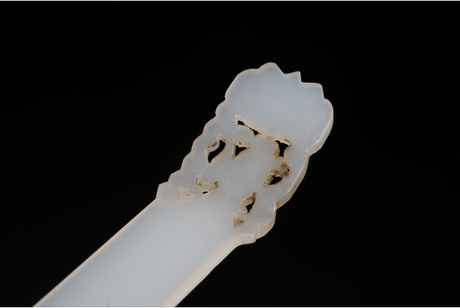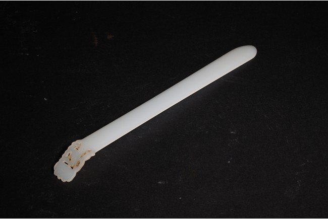 白玉製成,玉質潔白細膩,瑩潤光潔,簪頭鏤空雕製而成,簪身雕制精細,線條流暢。