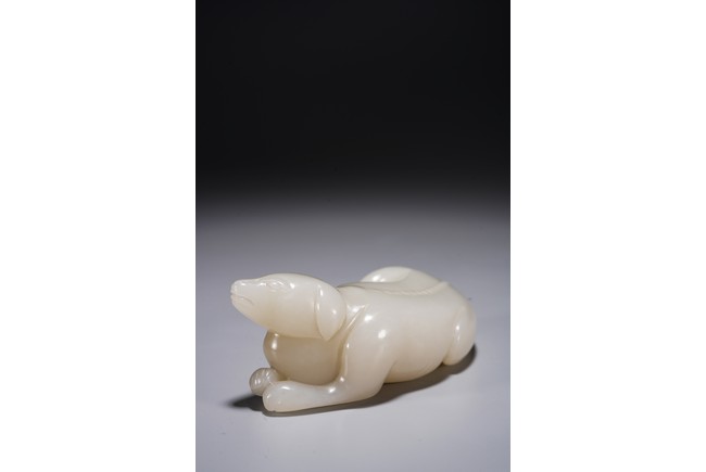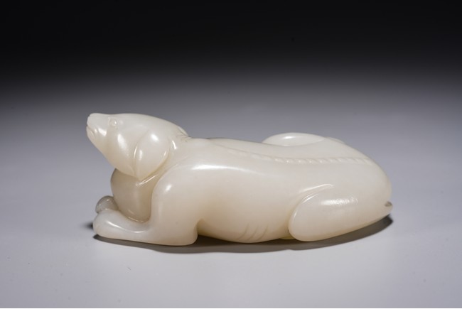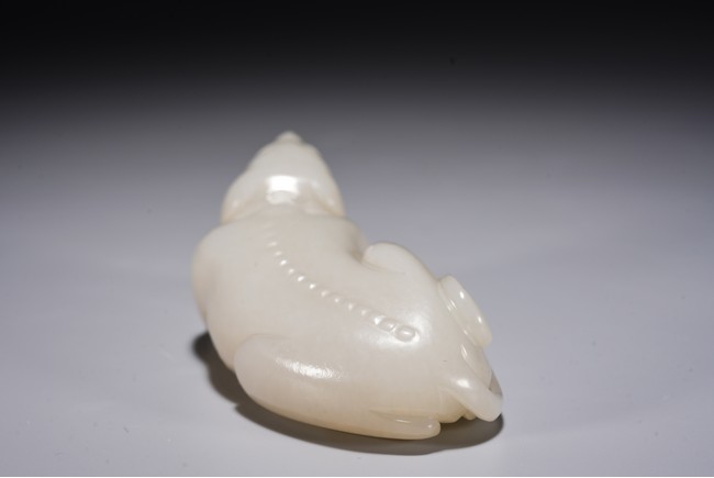 Chinese. Carved recumbent, its head facing forward, its body articulated by well defined ribs and a protruding spine, the smoothly polished stone of an even white color.