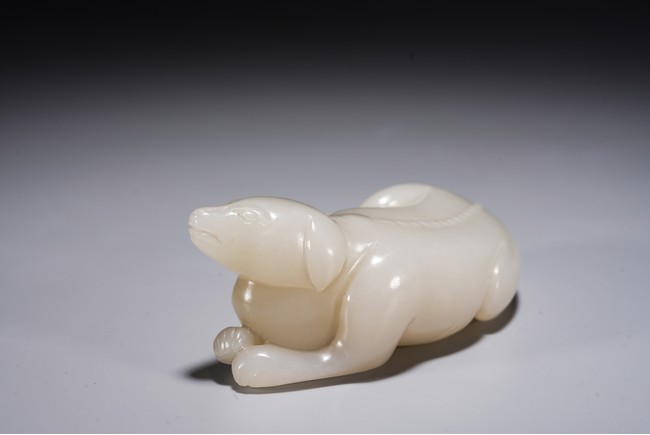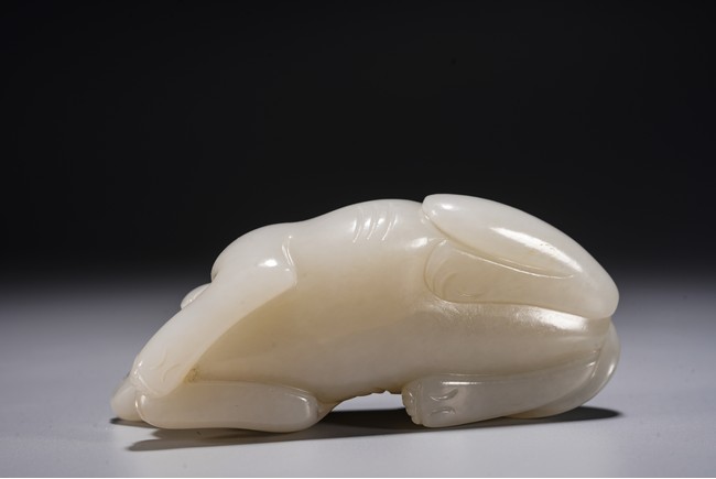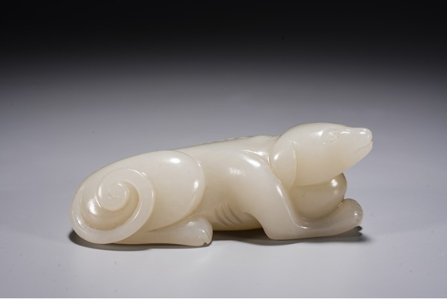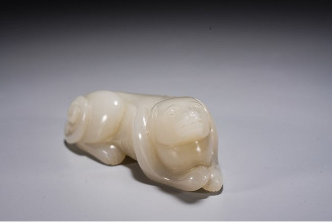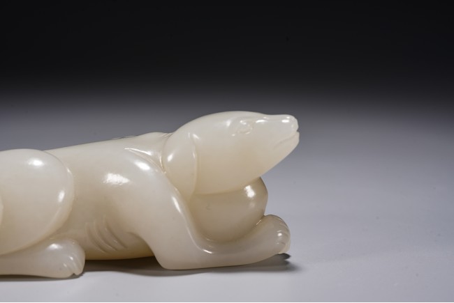 因文人喜將案頭玉器、銅器上把玩欣賞,信手鎮紙壓書,久而久之,兩者相合發展成為一種藝術與實用兼備的文房用具。此件瑞獸伏臥,雙足收於腹下,闊口鼻,大耳圓目。