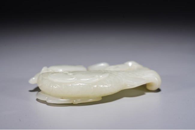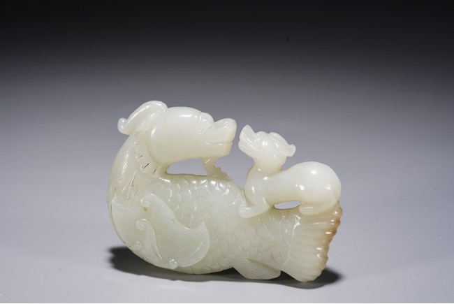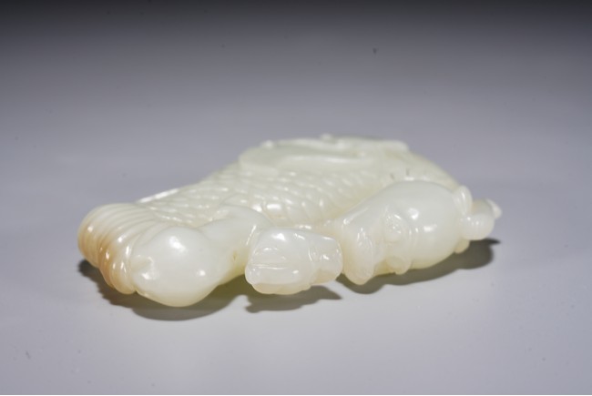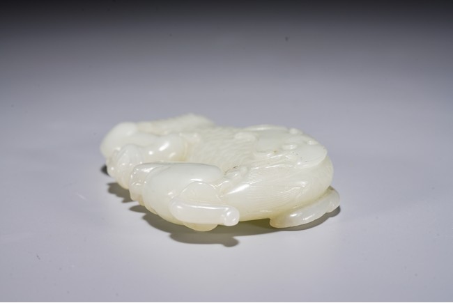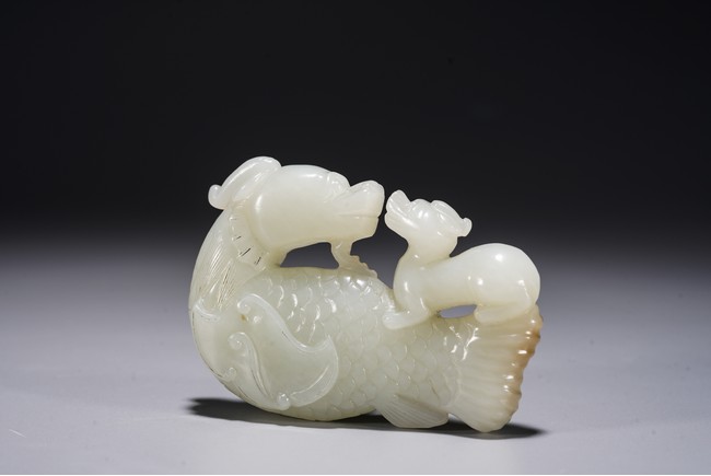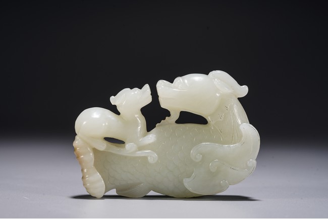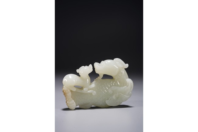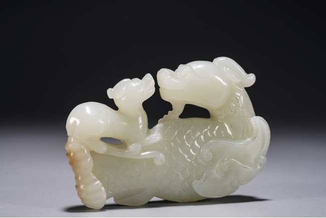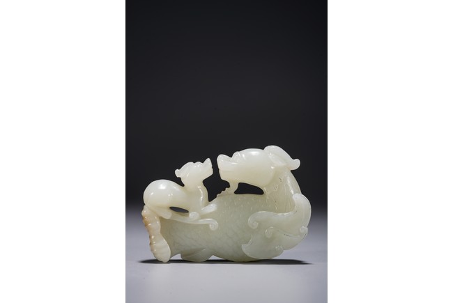 Chinese. Carved in the form of a mythical beast with dragon head and fish body, head sharply turned back and facing a smaller mythical beasat. The stone is of polished even white tone. Qing Dynasty period.
