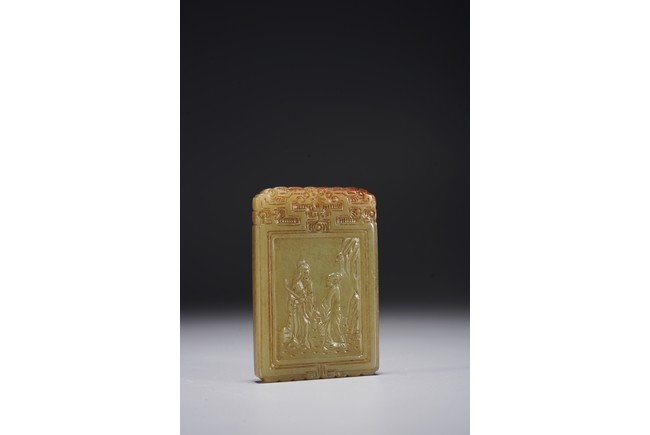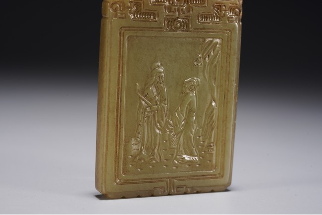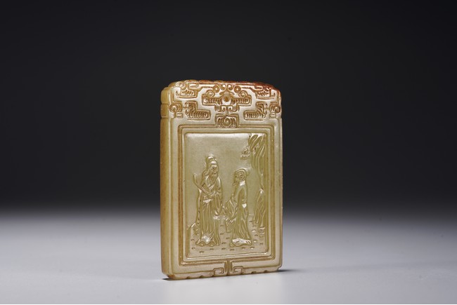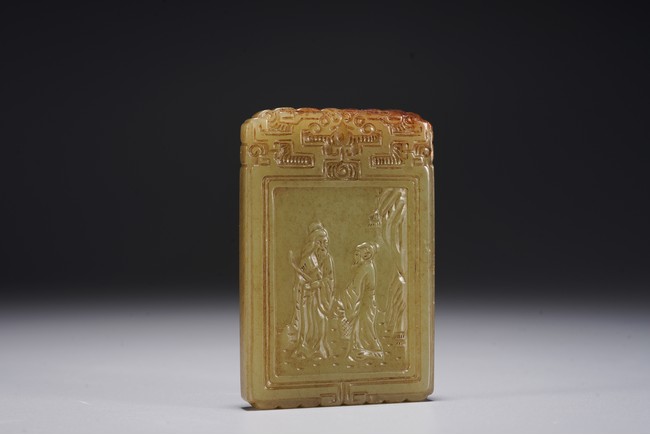 Chinese. Of rectangular form, the plaque carved in shallow relief with two scholars in conversation, the reverse incised with poem, the stone is of yellow tone with minor russet areas. Qing Dynasty period.