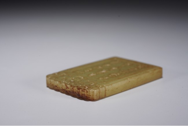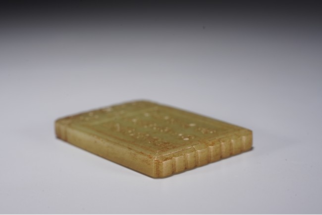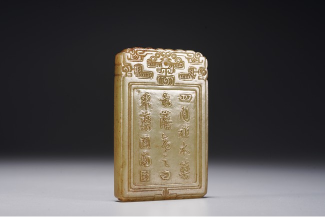 黃玉方牌,玉質溫潤,牌上下刻雲紋為裝飾,正面雕琢山林高士圖,背面配以詩文,意境高遠。
