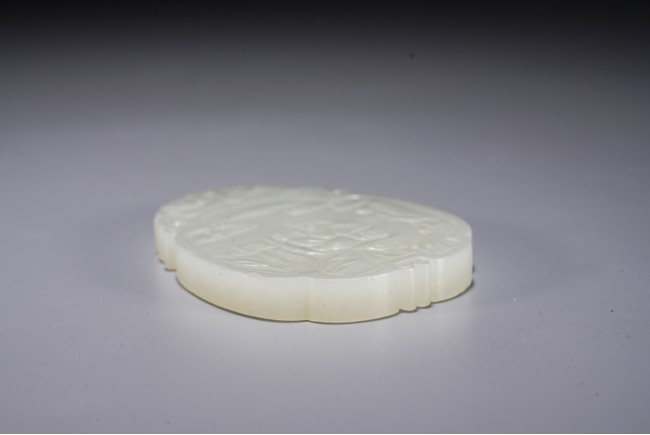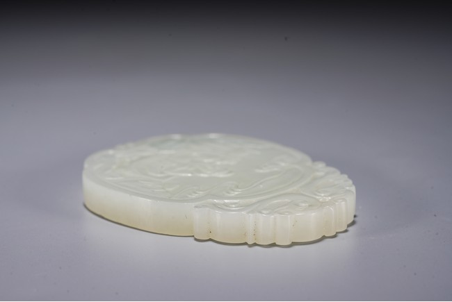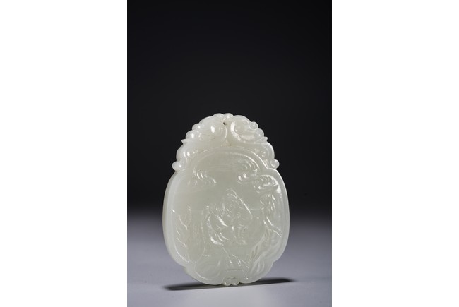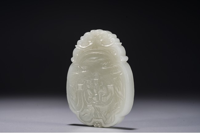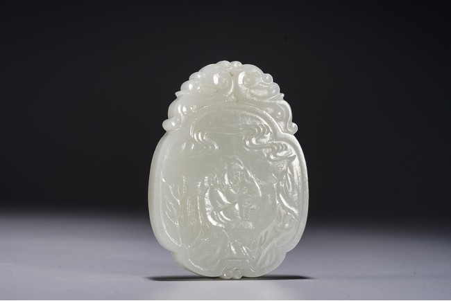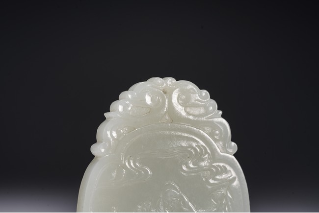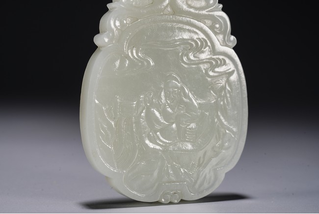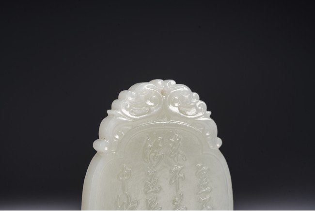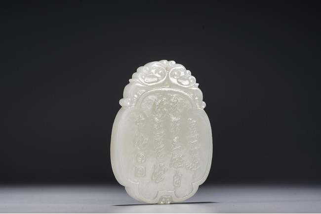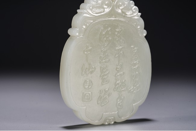 選料上乘,面呈長方形制,以整塊白玉琢成,質地通透。玉牌正反兩面均有工,其一面刻李白醉酒,神態微醺,頗具“黃河之水天上來”之韻味。此牌背面行草題詩。