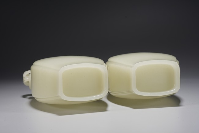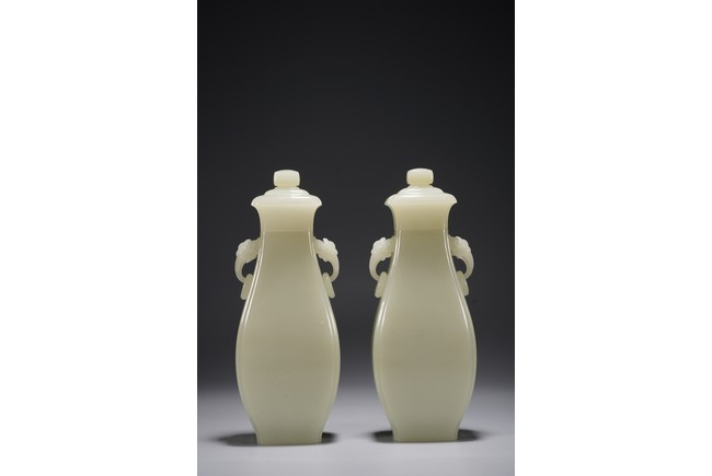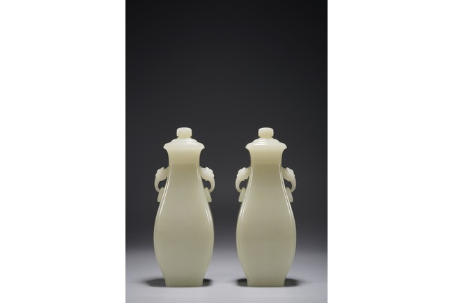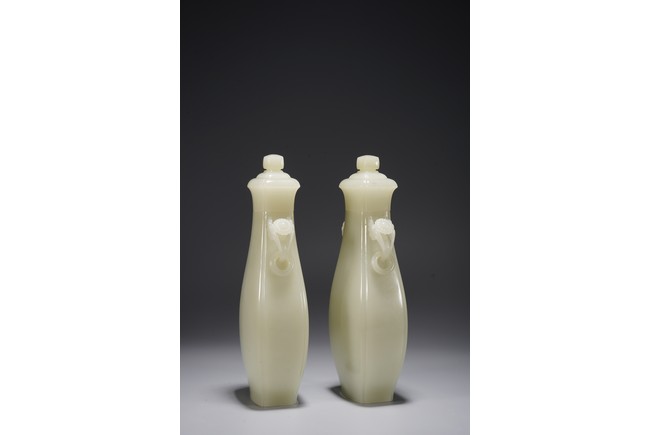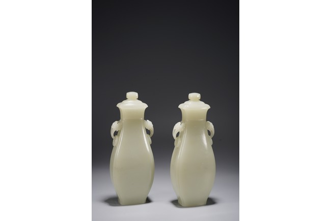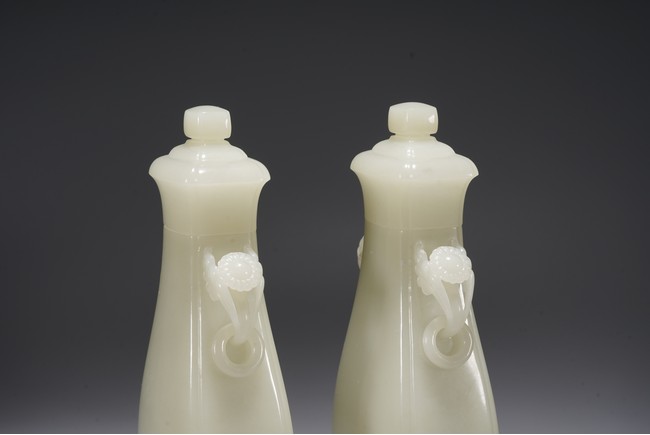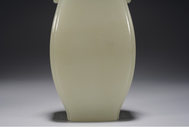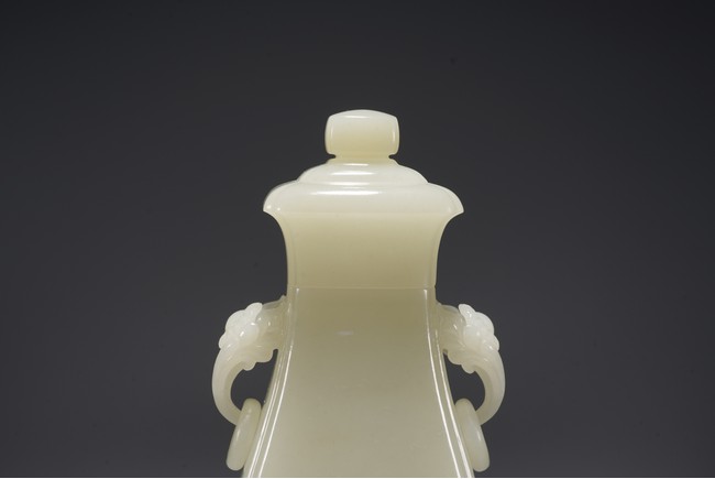 Chinese. Of pear shape, the waisted neck flanked by pair of handles suspended with loose rings, with flared cover and surmounted with a compressed globular finial. The stone is of even white tone. Republic period.
