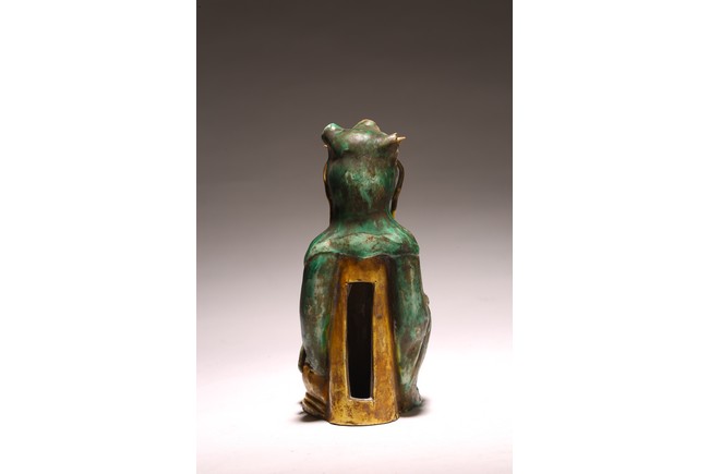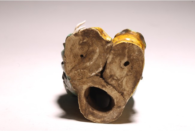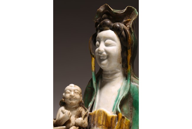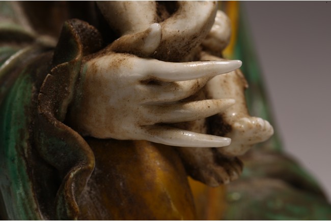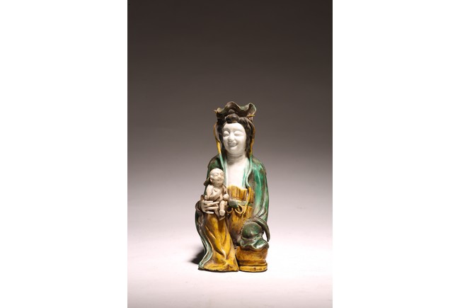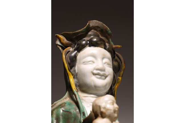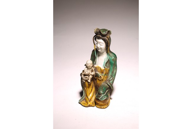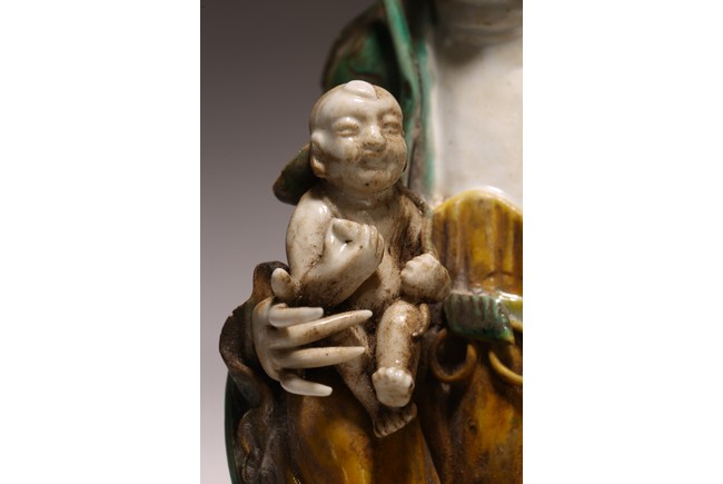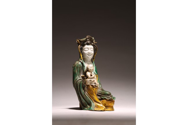 觀音面龐圓潤,長眉細眼,神色沉靜肅穆,髮髻高聳,頭戴發巾,著坦胸式寬袖大衣,飄逸自然,左手持童子,右手自然搭下。衣飾以素三彩裝飾,以黃、綠、褐三色為主。 來源: 俄亥俄州前 NASA 科學家私人收藏 Provenance: Property from an ex-NASA scientist's collection in Ohio
