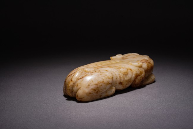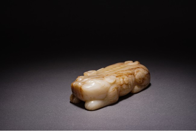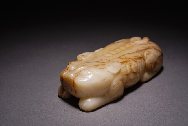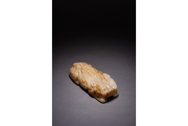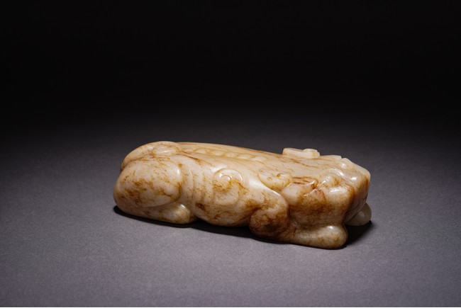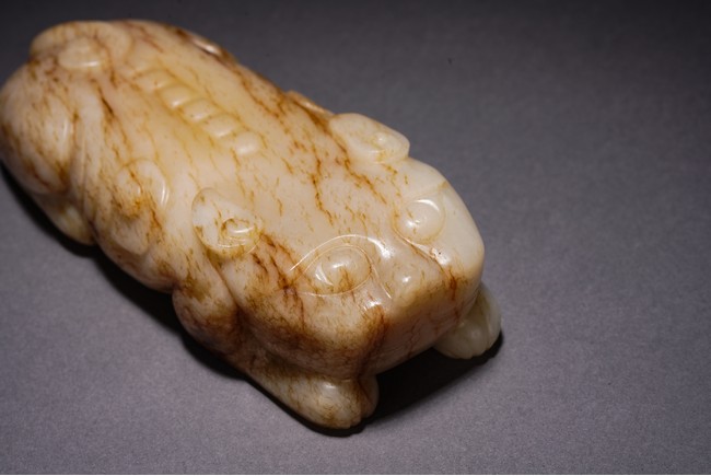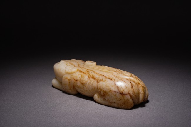 Chinese. Carved in the form recumbent beast, with protruding eyes and large mouth, the stone is of white tone with russet streaks and veinings. Ming Dynasty period.