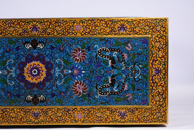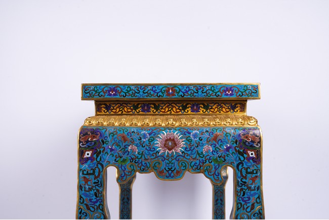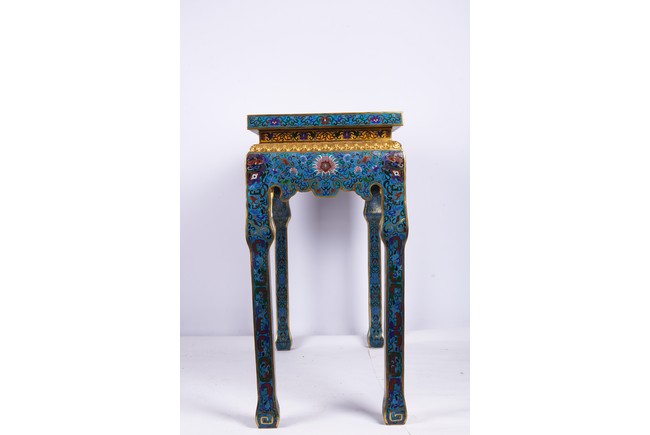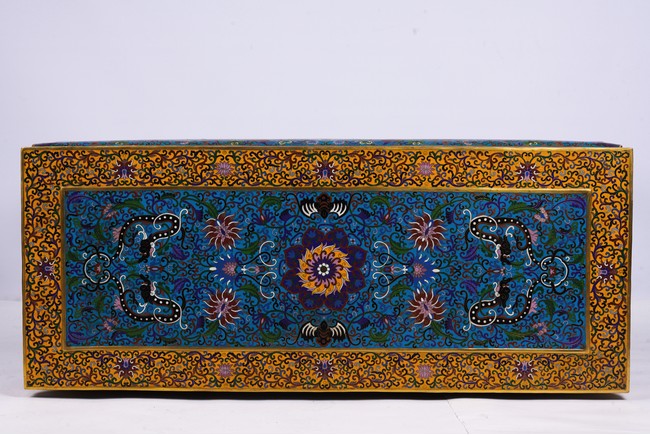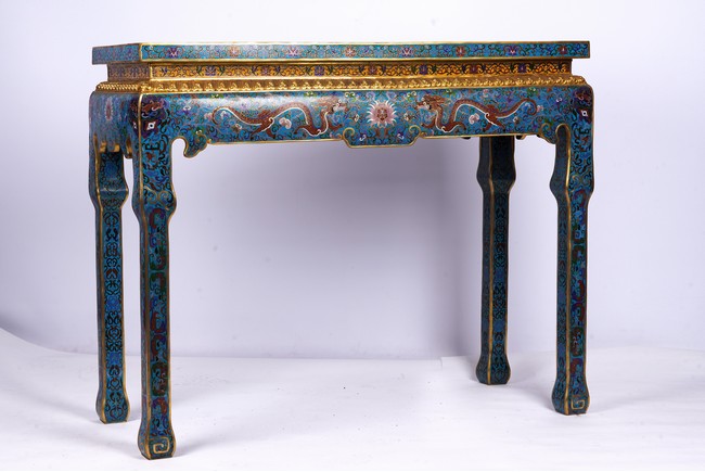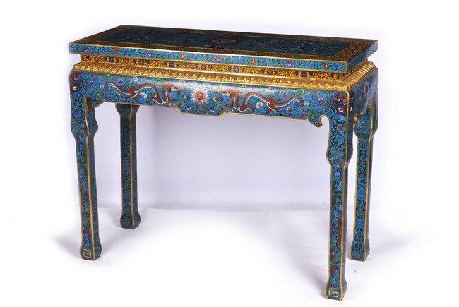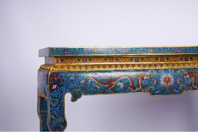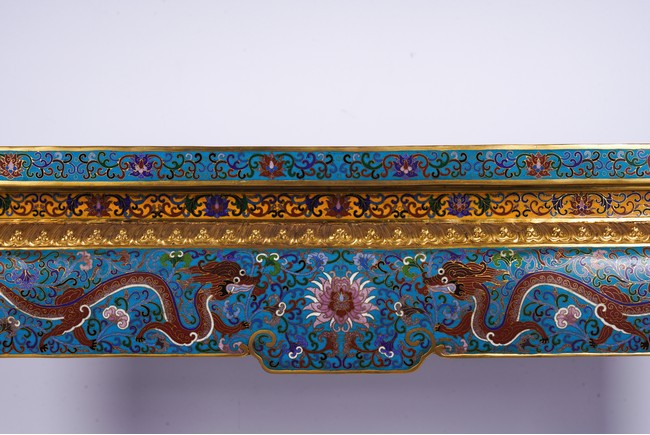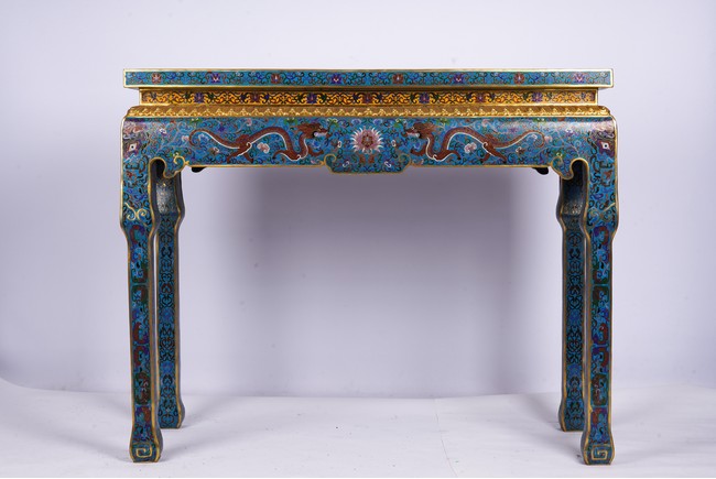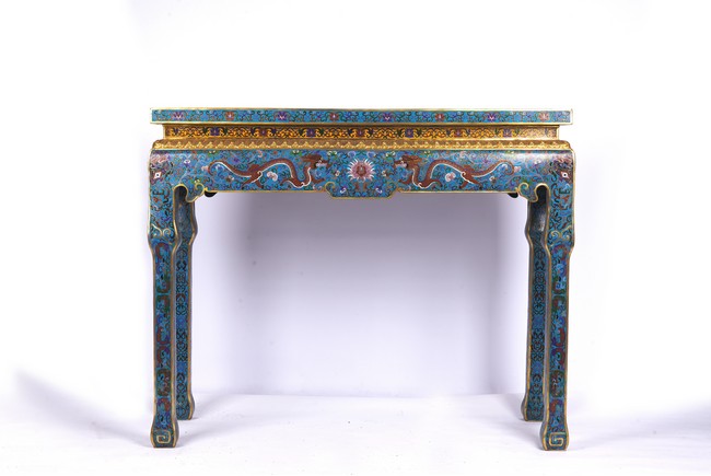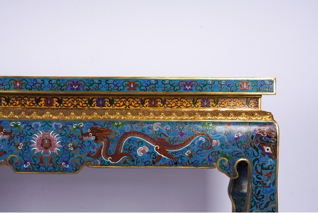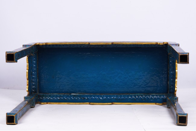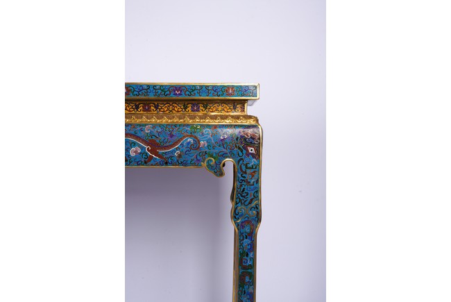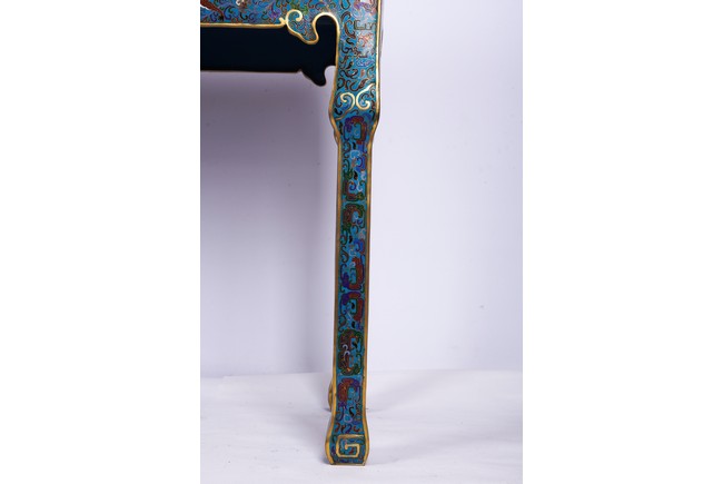 掐絲琺瑯又稱景泰藍,此景泰藍條案的製作既運用了青銅和瓷器工藝、又融入了傳統手工繪畫和雕刻技藝,堪稱中國傳統工藝的集大成者。景泰藍作為陳設器較常見,作為家具實屬罕見,此拍品做工精細,用料極為考究,兼收藏與實用價值,實為上品。 來源:佛羅裡達私人收藏 Provenance: From a private Florida collection
