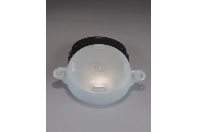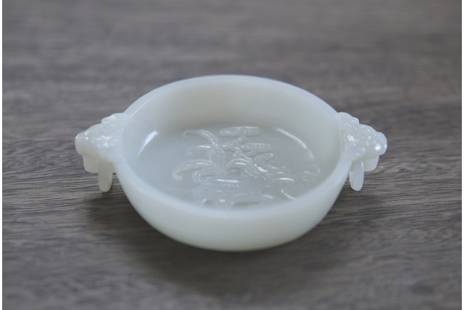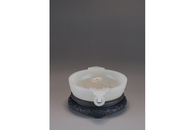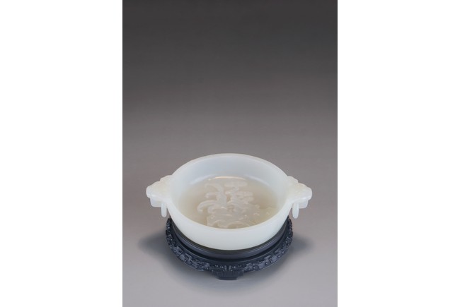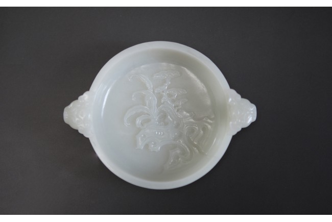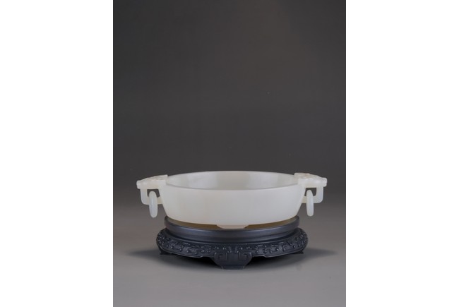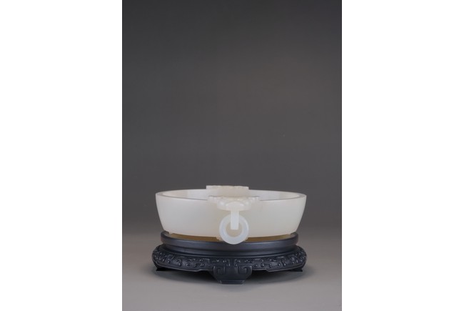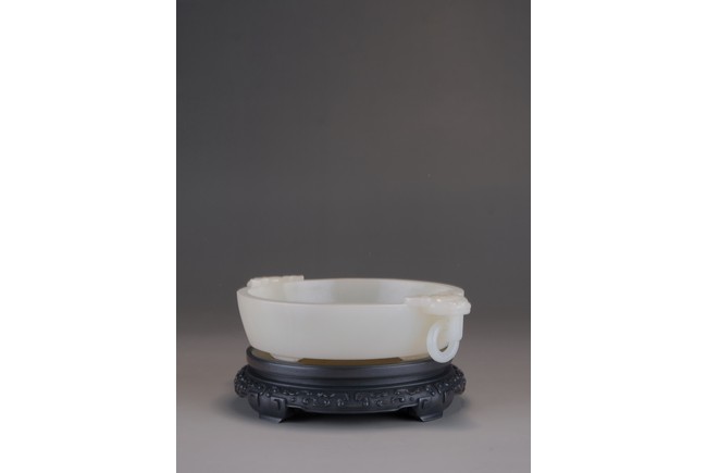 清代內廷玉作有了充足的玉料,和闐美玉的大量輸入,加之宮廷的大力提倡,使得這 一時期的玉器生產出現了高潮。玉器題材的廣泛,數量的巨大,工藝的高超都是前所未有的。玉洗乃是文房用具,是文人們在書房盛水洗筆之器,所以又被稱為筆洗。玉筆洗從唐代開始 逐漸增多,到明清時代達到高峰。玉製文房用具在宮廷中佔有一定的位置,這與清代乾隆皇 帝愛玉賞玉有很大的關係。而以乾隆皇帝為代表的上層社會對玉器的推崇更使文房用具成為 玉器精湛工藝的載體。此器以上等和闐白玉製成,用料珍稀,潔白如脂,溫潤光澤, 光華晶透。此洗敞口,弧壁淺腹,底承四足。洗心內浮雕飾“靈芝”“蘭草”“山石”,靈動 傳神,線條流暢,靈芝飽滿,枝葉舒展。飾雙獸耳銜環,雕琢精緻華麗,雙獸威武神秘。本 品華美優雅,技藝超凡,底部陰 刻“宜子孫”方型款識。 “宜子孫”印文:乾隆喜歡在上等書畫上蓋上“宜子孫”的璽印, 有希望子孫好好守護愛惜物品之意。 來源:重要紐約私人玉器收藏 Provenance: Property from an Important NYC private Jade collection