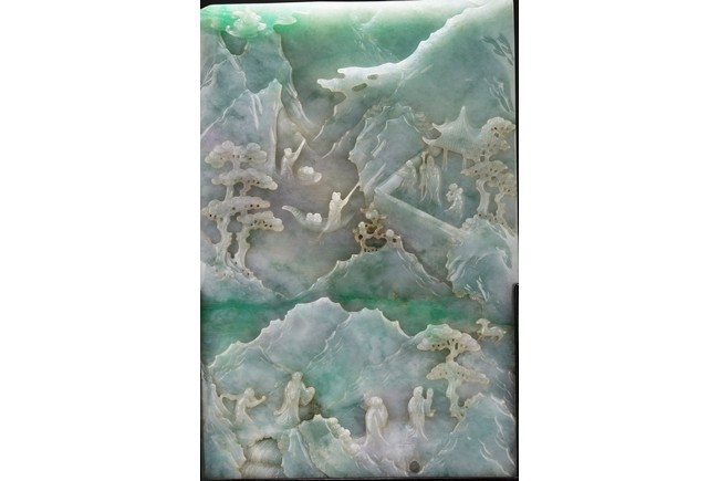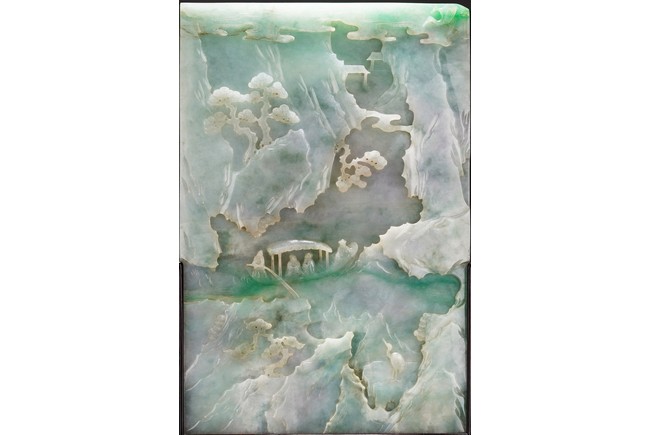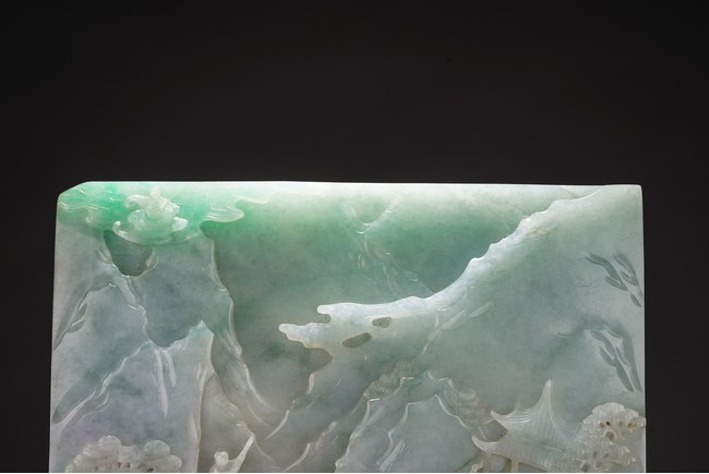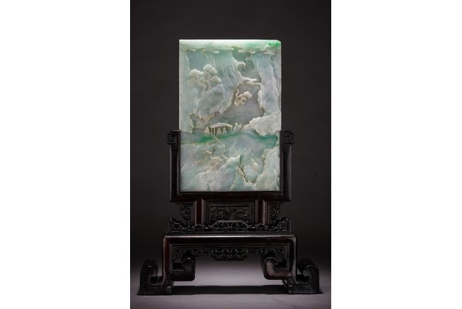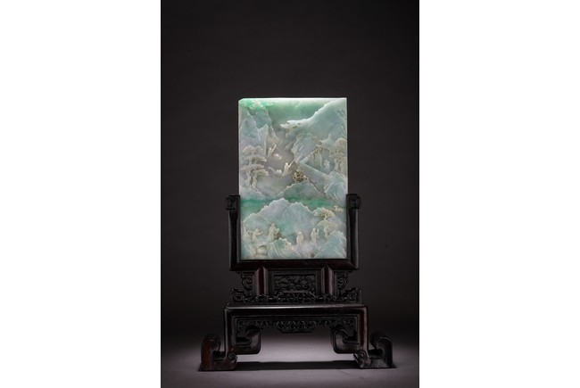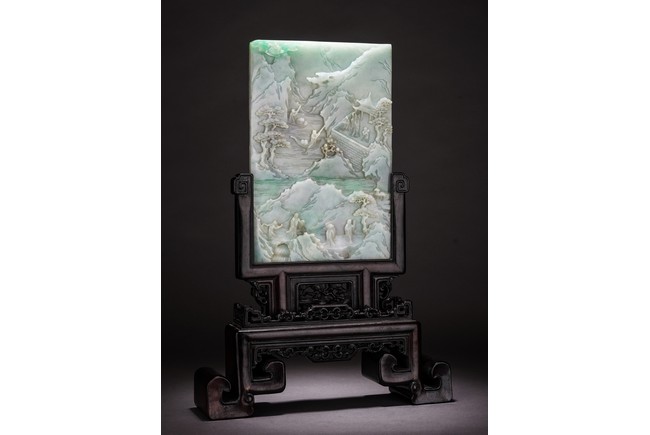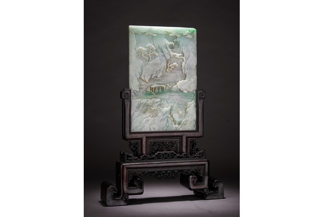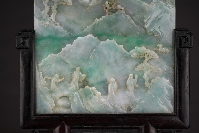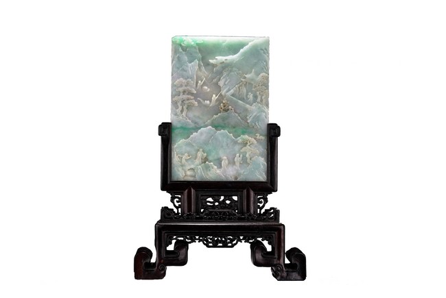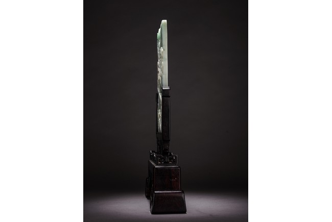 此插屏由屏座和屏心組成,屏座紫檀為材,紋理細膩緻密、色澤沉穆典雅,莊重古樸,屏心呈長方形,翡翠質地一流,翠色透潤,水頭足,光澤亮麗,器面雕刻山水風景人物故事圖飾,紋飾刻畫精細,雕工嫻熟,刀法深峻圓潤,細膩流暢,佈局景物如畫,質料均佳,包漿潤澤,實為雋品,若置於書齋,可鑑詩意之美,亦得清賞之樂。 來源:南帕薩迪納私人收藏。當前所有者的父親在 1980 年代至 1990 年代的某個時候在倫敦南部收購,然後傳給了所有者。 Provenance: Private collection, South Pasadena. The current owner's father acquired in South London sometime during the 1980s-1990s and thence passed to the owner.