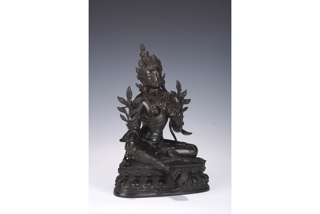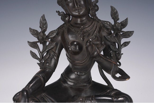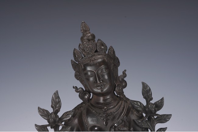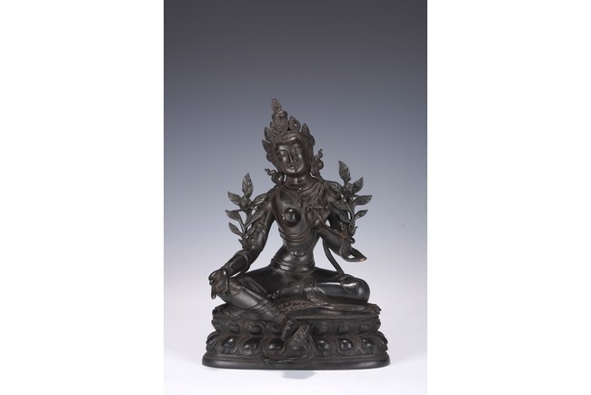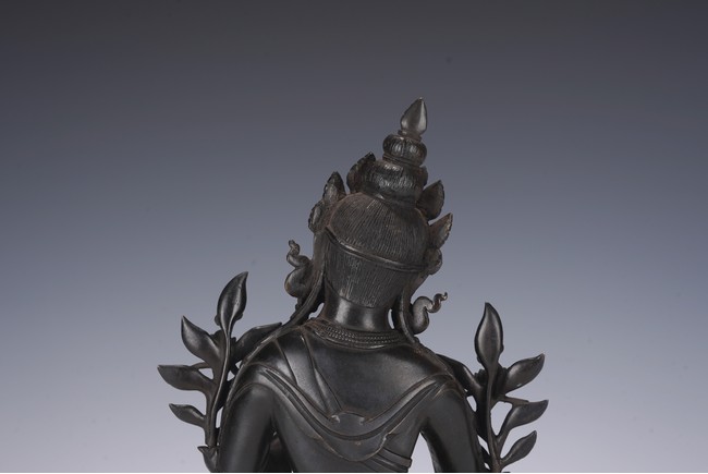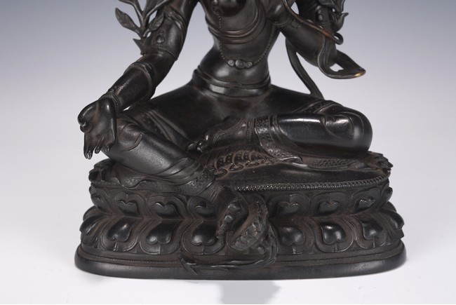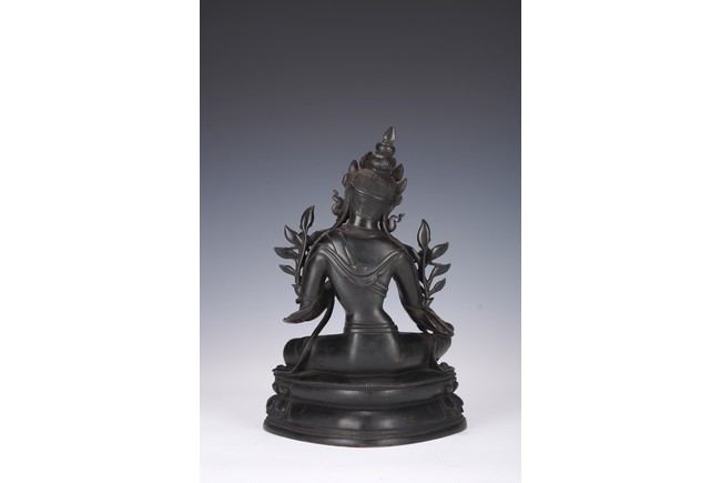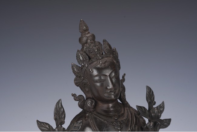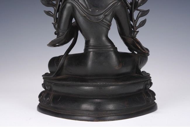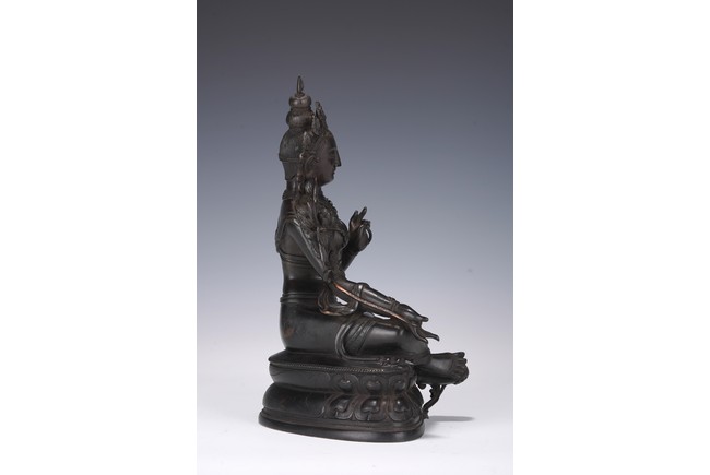 Chinese. Seated in lalitasana on a double-lotus base, the right hand held in varadamudra and the left raised to the chest in vitarkamudra, wearing a dhoti and a loose shawl over the shoulder, adorned with bejewelled necklaces. the face with a benevolent expression, crowned with a tiara in front of a high chignon. Qing Dynasty period.