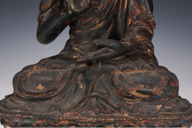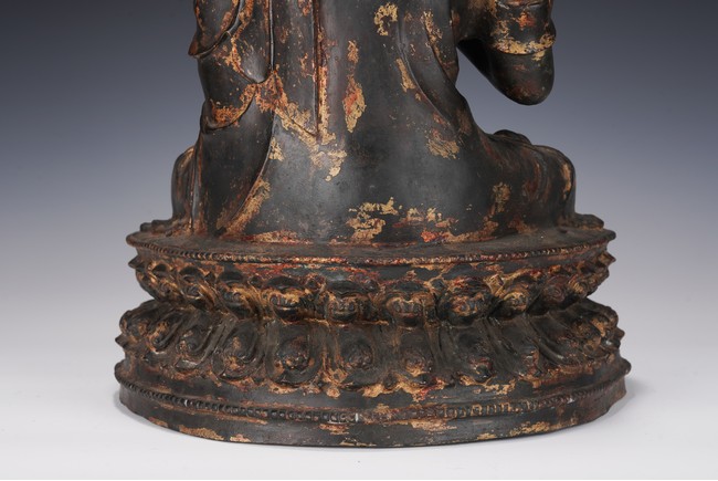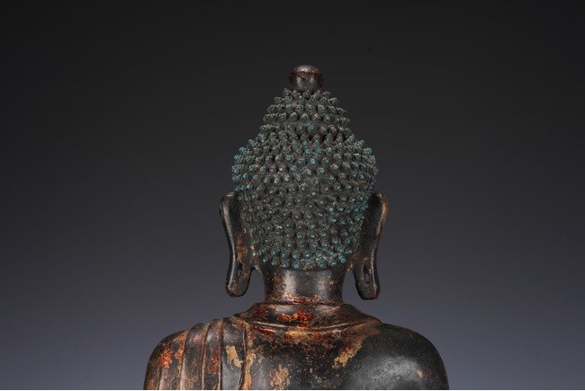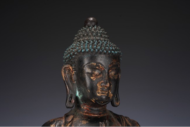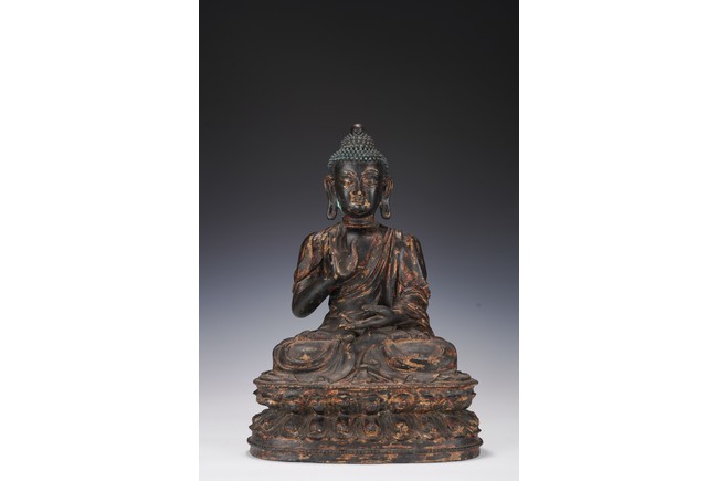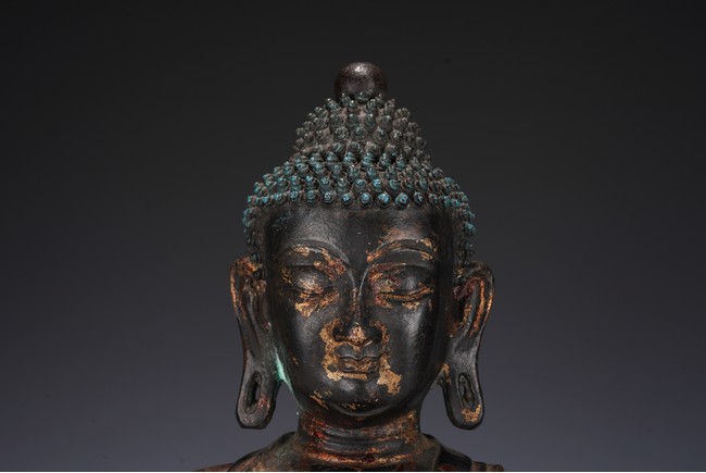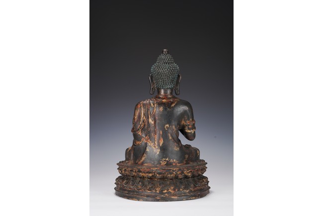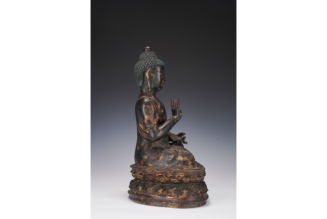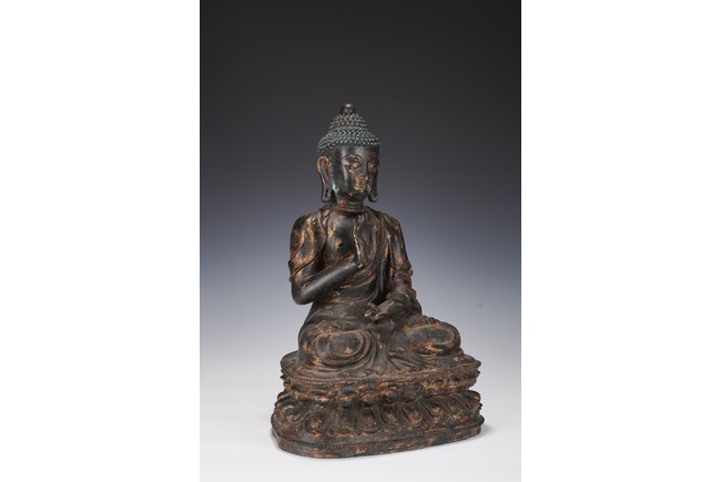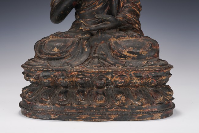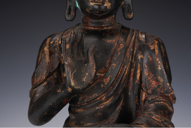 Chinese. Cast seated in vajraparyankasana on a double lotus throne, the right hand raised in vitarkamudra, the left hand in dhyanamudra, wearing a diaphanous robe falling in undulating folds around the legs, the serene face with downcast eyes and a meditative expression, flanked by long ears with pendant pierced lobes, the head and domed ushnisha covered with tight curls and surmounted by an ovoid jewel. Ming Dynasty period.