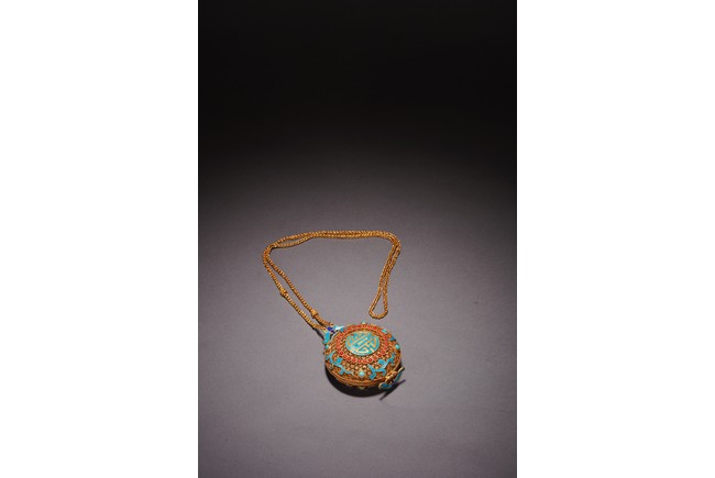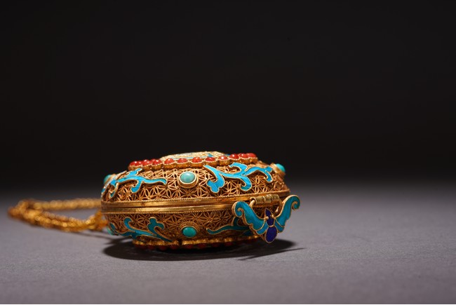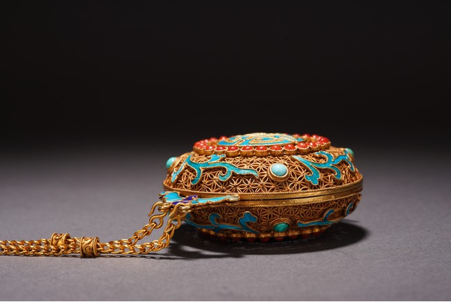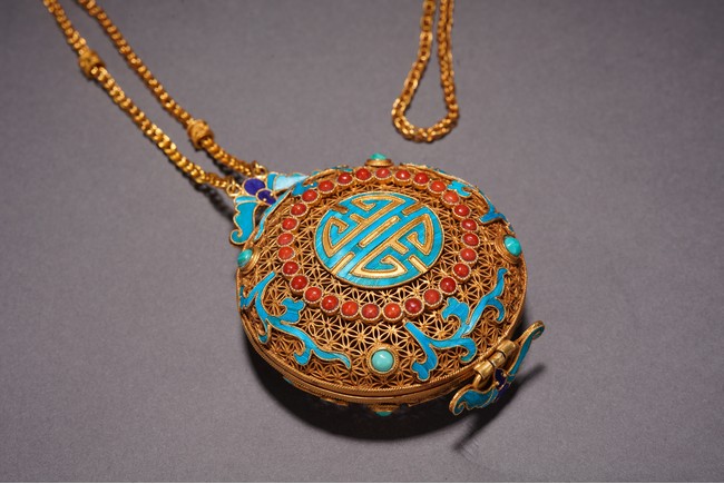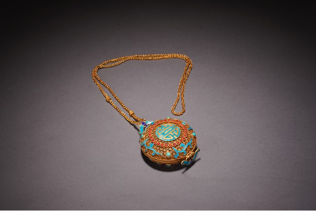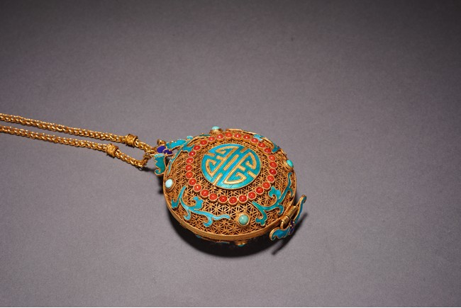 Chinese. Inlaid with red gem, turquoise, and kingfisher feather to the exterior forming the stylized 'shou' character. Qing Dynasty period.