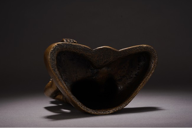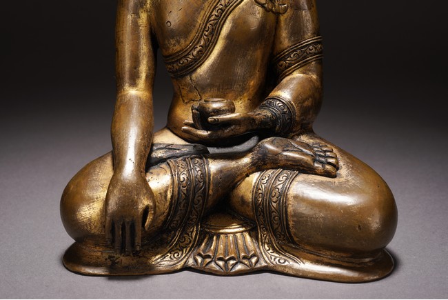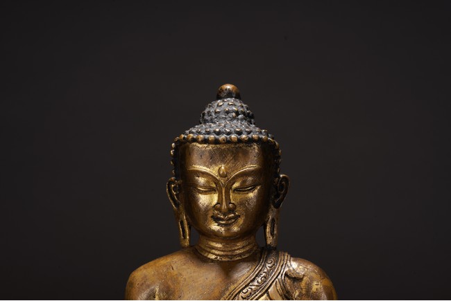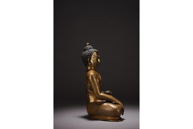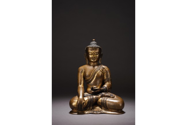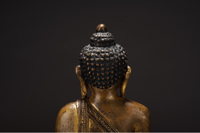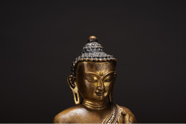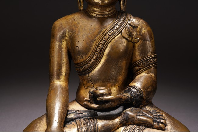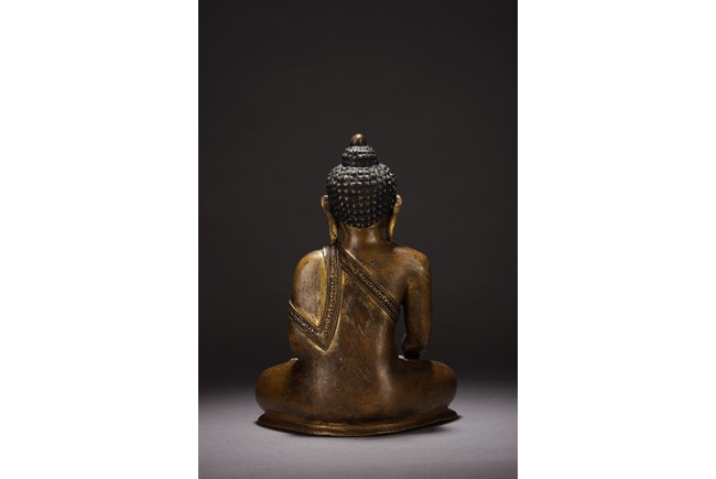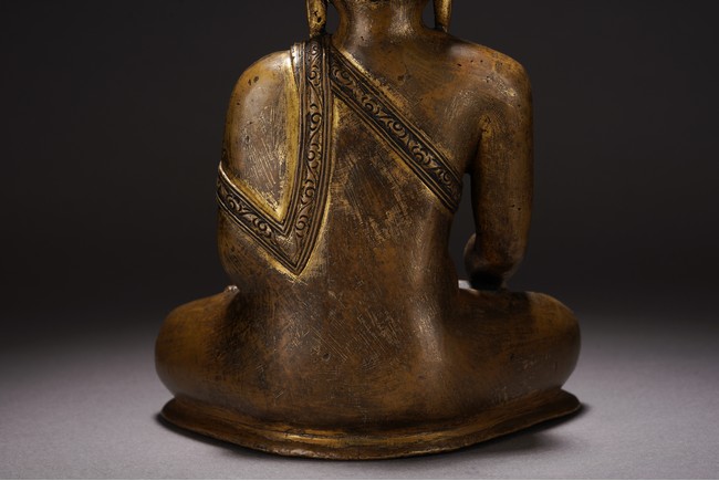 Seated in vajraparyankasana, the right hand extended in bhumisparshamudra and the left in dhyanamudra holding the alms bowl, wearing a sanghati gathered on one shoulder, the serene face with a meditative expression. Ming Dynasty period or later.