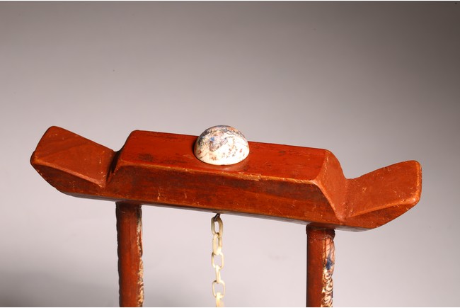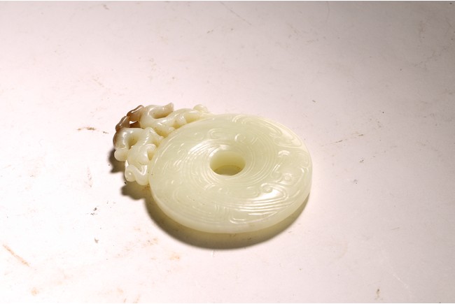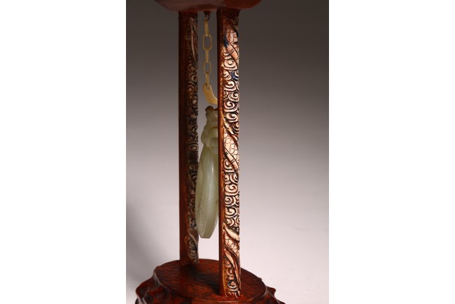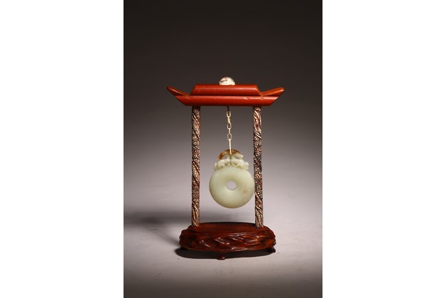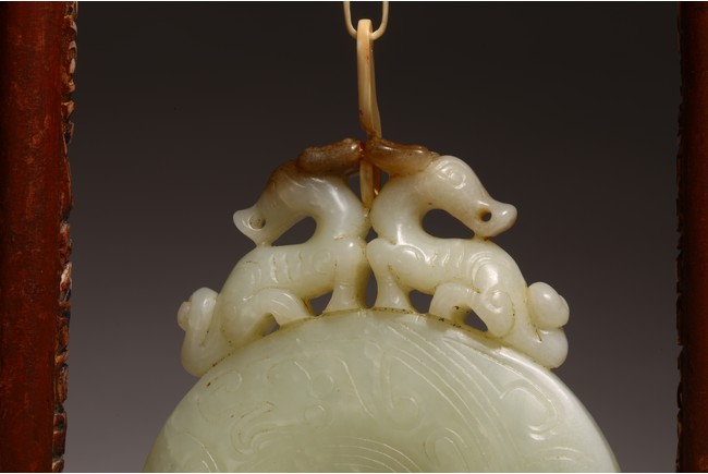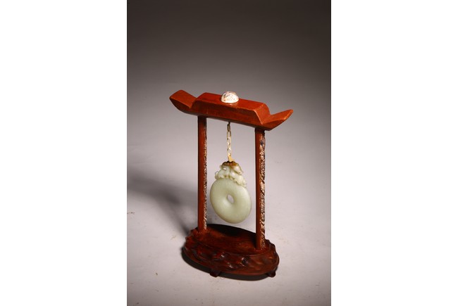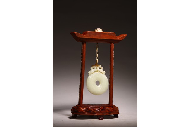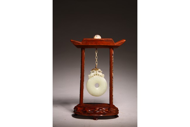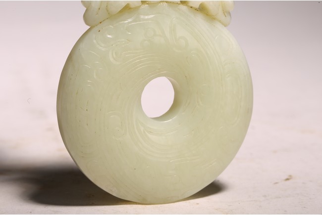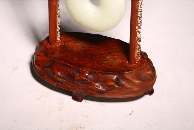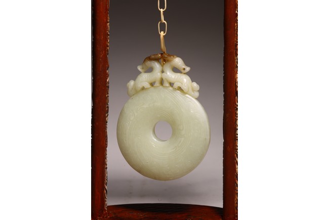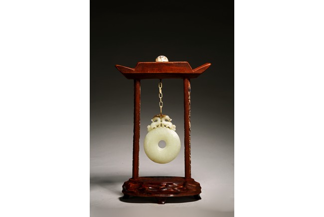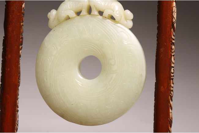 Chinese. The jade disc bi carved with stylized pattern and topped with pair of opposite facing mythical beasts in round, all supported on a wooden frame and stand. Qing dynasty period, 18/19th century.
