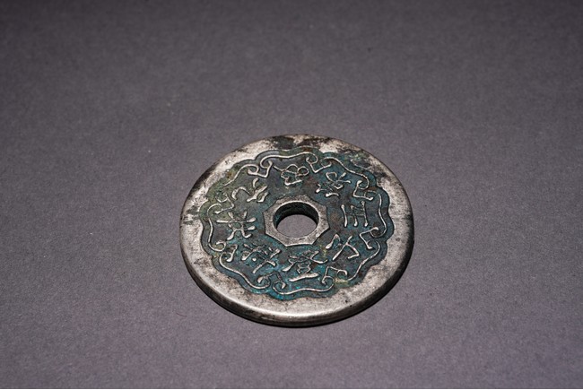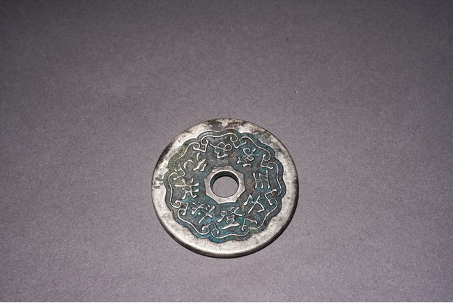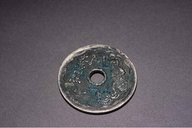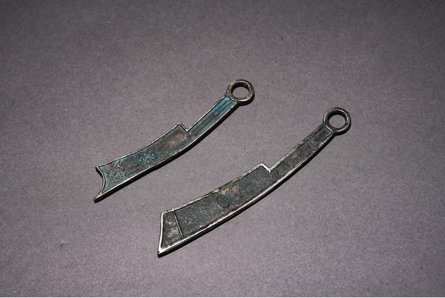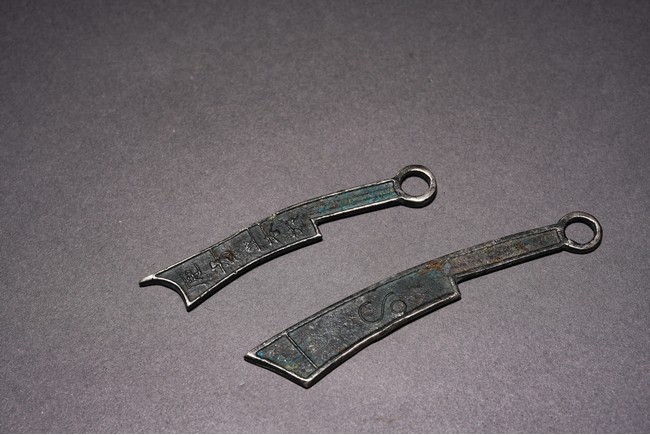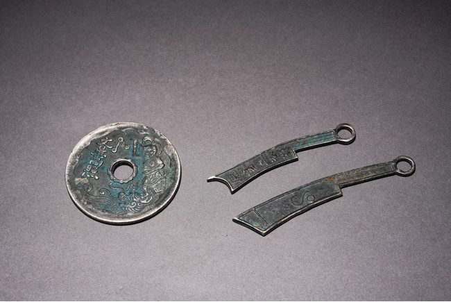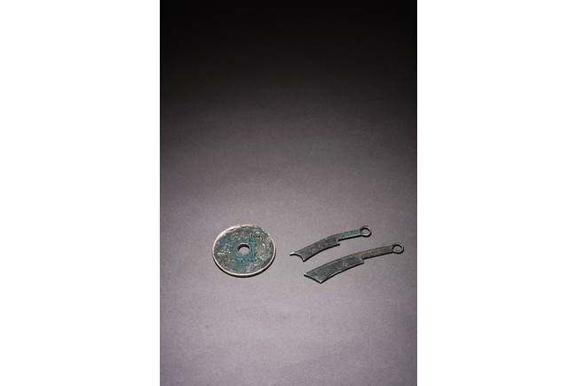Chinese. Comprising of two 'knife money' with inscriptions and one circular coin with inscription and a boy figure and characters on the back. Song Dynasty period or later.