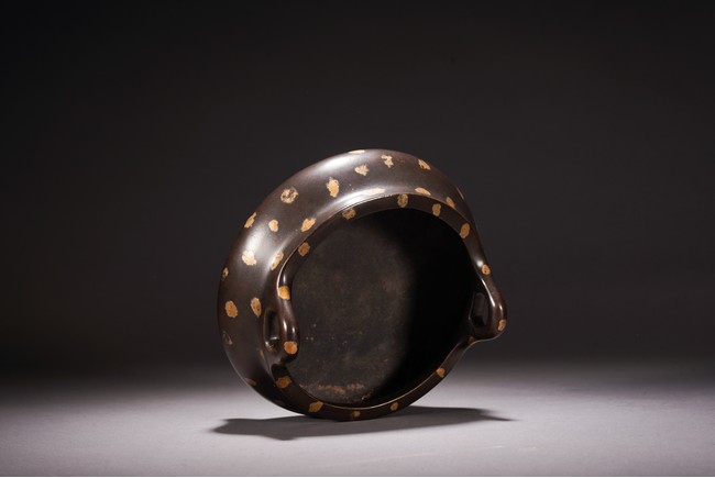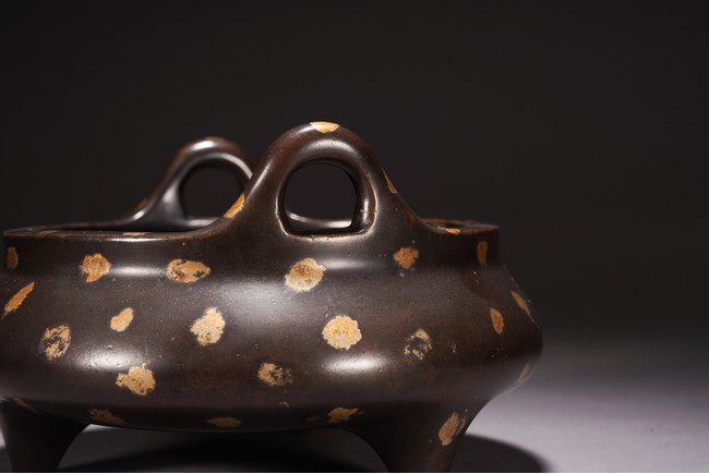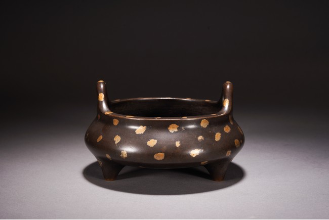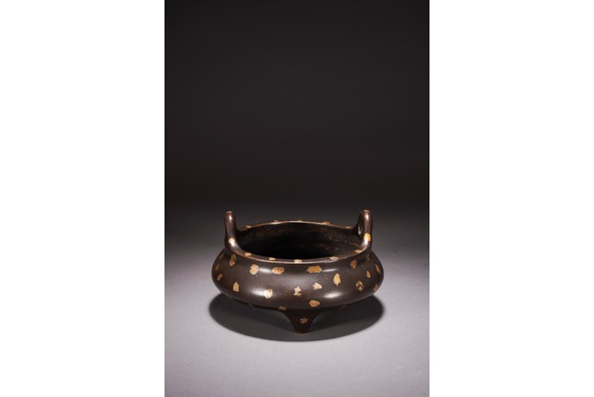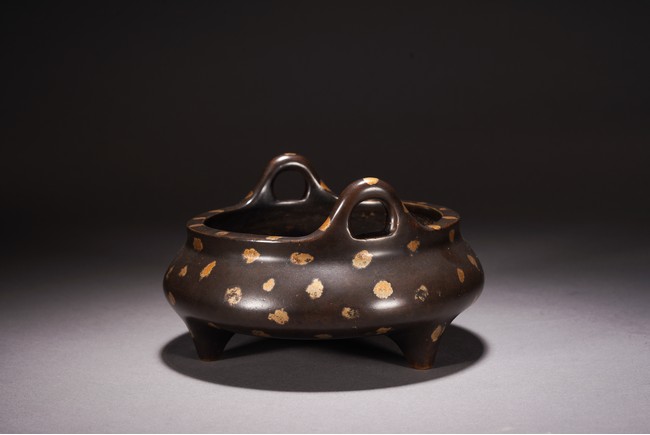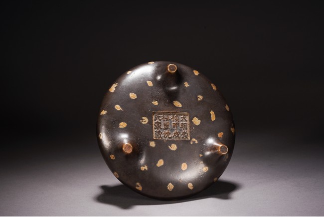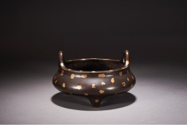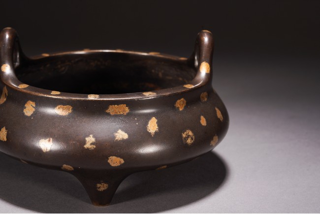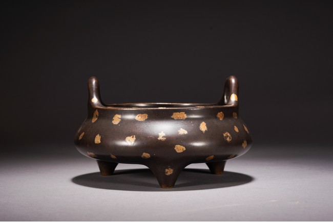 Chinese. The compressed globular body supported by three conical feet, with a pair of loop handles rising from the rim, decorated overall with irregular gold splashes, the base cast with reign mark dated to the Congzhen period. Qing Dynasty period.