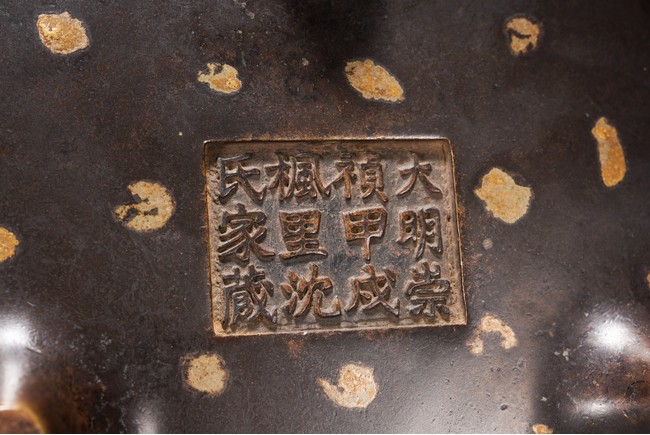 此三足爐為銅質,“大明崇禎甲戌楓裡沈氏家藏”款,敞口,扁圓腹,雙耳沖天,下承三乳足,造型古樸大方,器形規整;爐面通體灑金斑,金斑層次豐富,圓潤規整,包漿渾厚,極具質感,當屬佛前供器,實為一件十分少見的香爐。