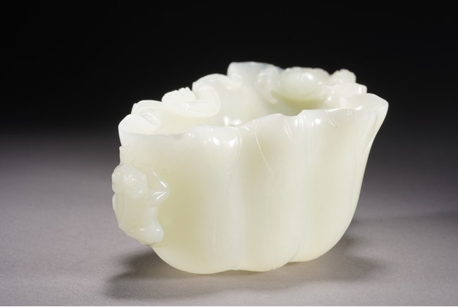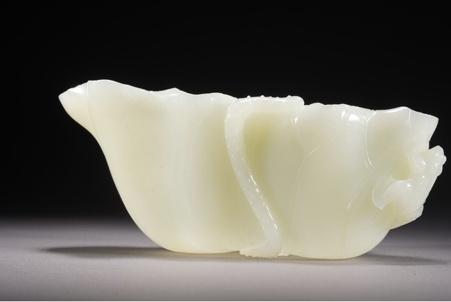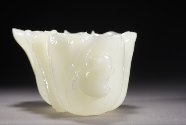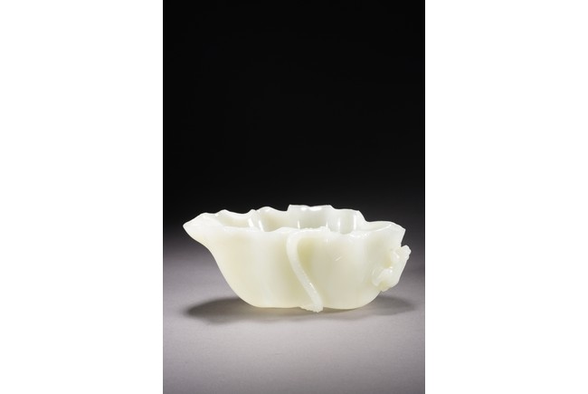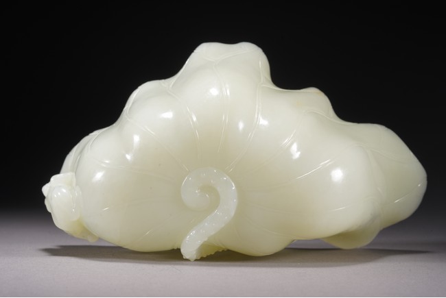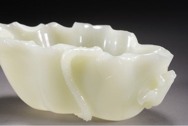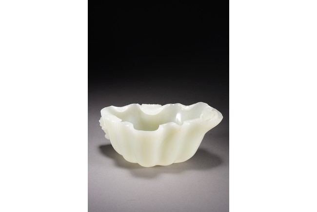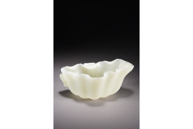 此筆洗質地白净溫潤細膩,呈荷葉型。荷花自古以來都代表了中國文人出“淤泥而不染,濯清漣而不妖”的精神。在清代白玉常被用來雕琢成各種植物形式的文房用具,反應了清代學者們崇尚自然的文人雅趣。邊上附著魚、蟹、青蛙,雕工精美,造型飽滿別緻,刀法簡練有力。 來源:洛杉磯重要私人收藏 Provenance: Property from an important Los Angeles private collection