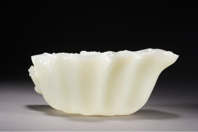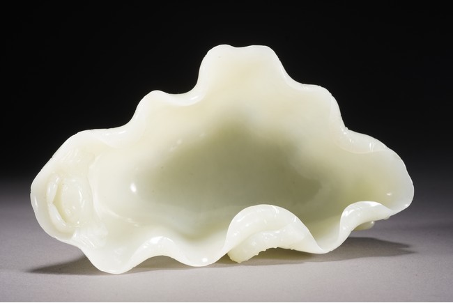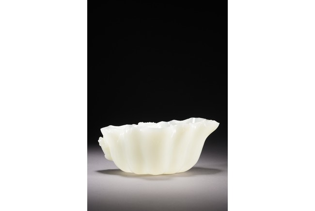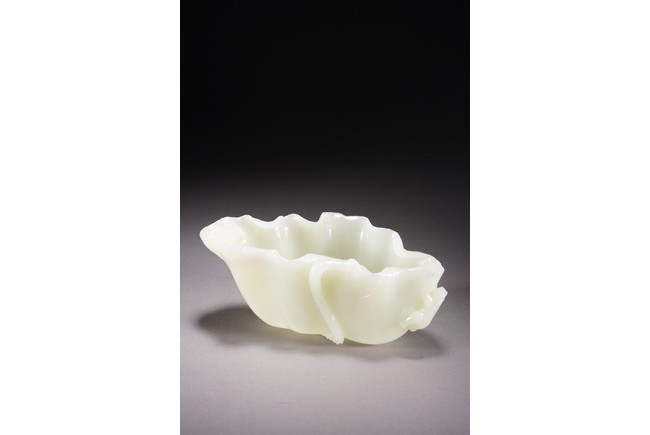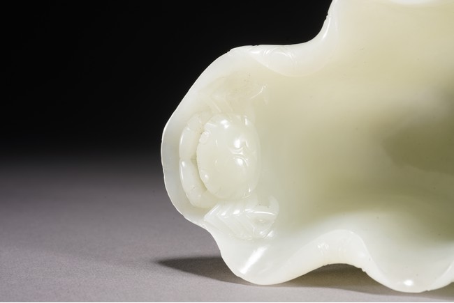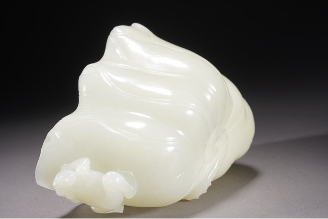 Chinese. The washer carved as a furled lotus leaf borne on stems issuing lotus flowers, the exterior carved with a frog. The stone is of even polished white tone. Qing Dynasty period.